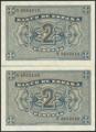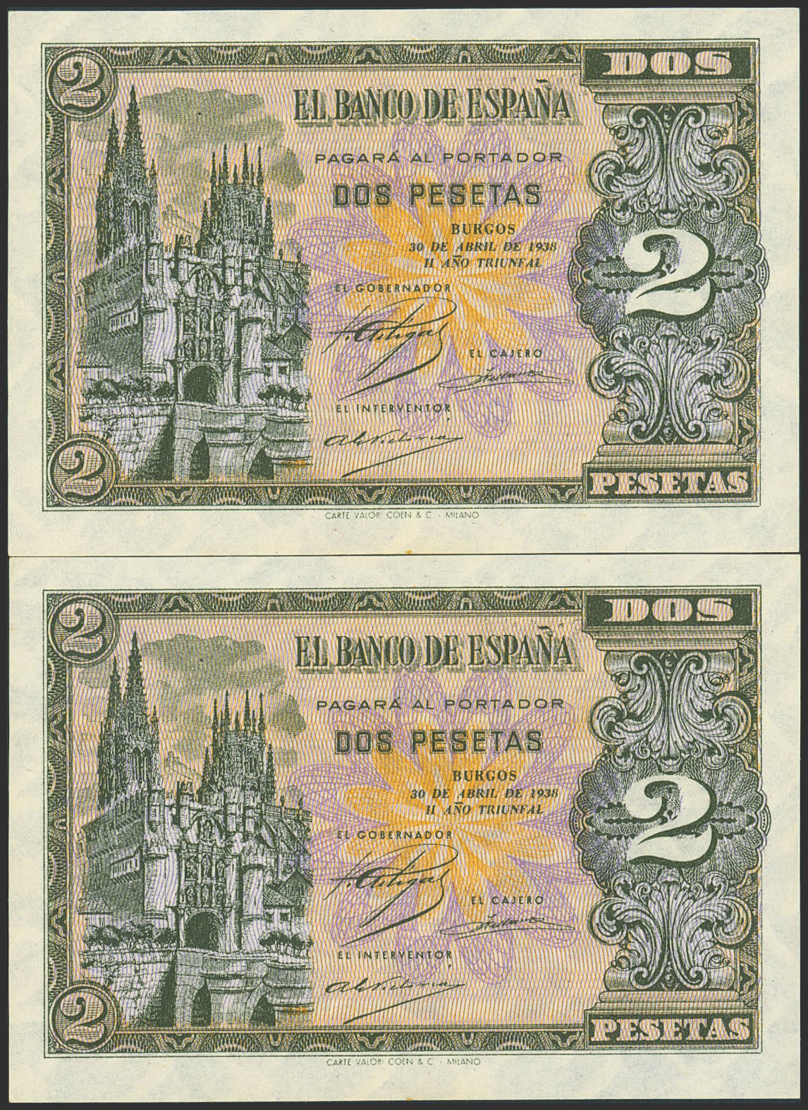 2 Pesetas. April 30, 1938. Correlative pair. Series N, last series issued. (Edifil 2023: 429b). Original marking. Uncirculated.