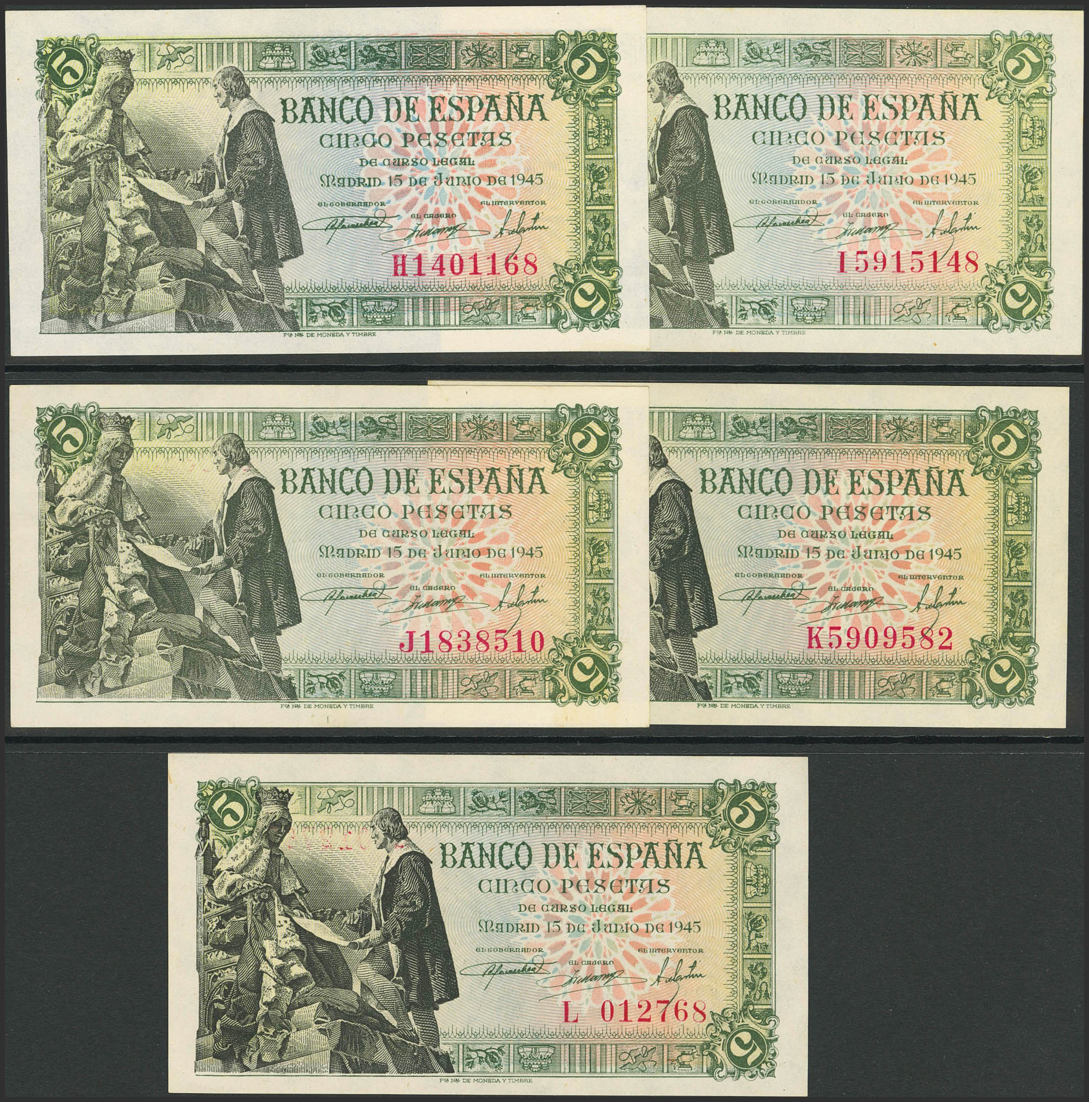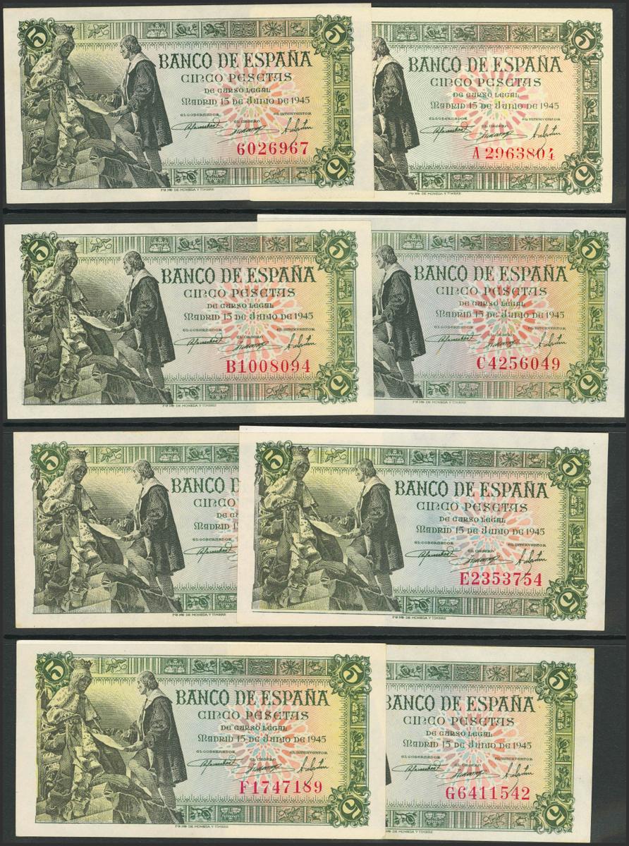 Set of 13 5 Pesetas banknotes issued on June 15, 1945 and corresponding to all known series including the one without series and series A, B, C, D, E, F, G, H, I, J (Good Very Fine is the worst preserved), K, L, last series issued (Uncirculated and sized) (Edifil 2021: 449, 449a). Very rare set that includes all the different series. Uncirculated/Extremely Fine.