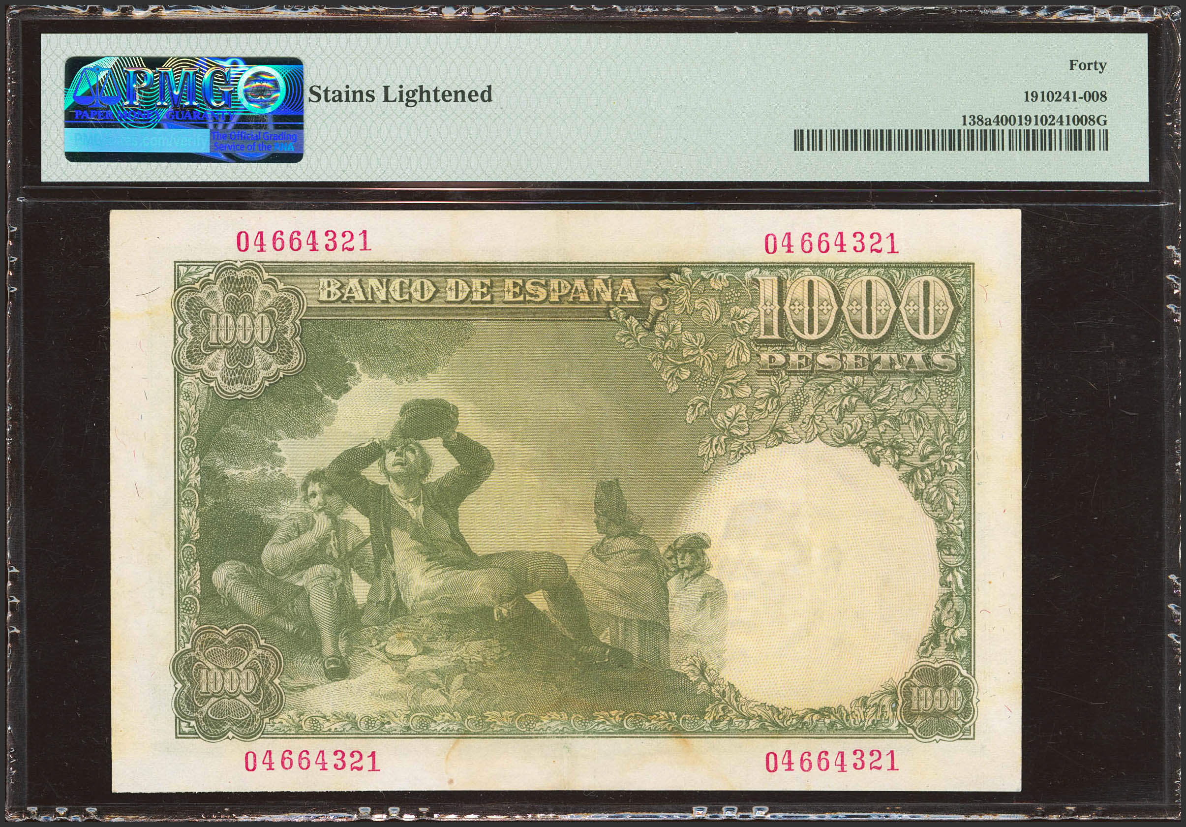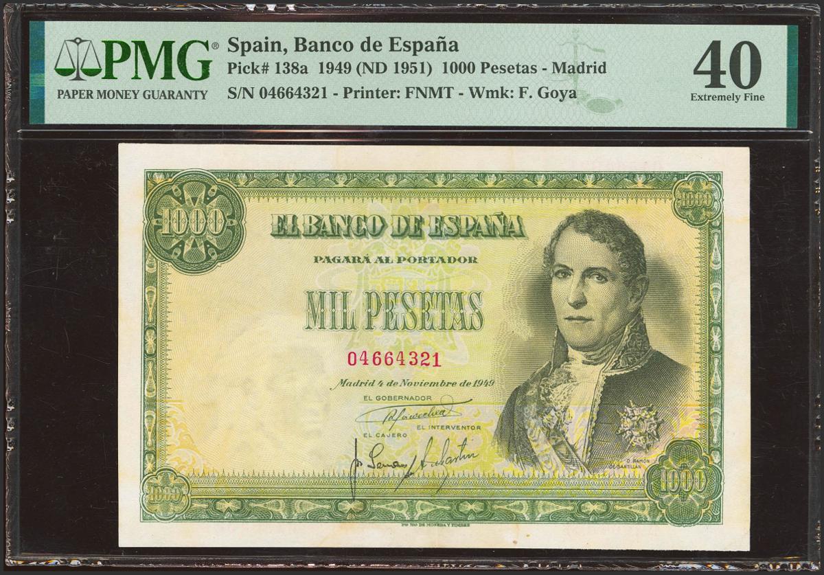 1000 Pesetas. November 4, 1949. No series. (Edifil 2023: 458, Pick: 138a). Time stains. Extremely Fine-. Encapsulated PMG40 (stains lightened)