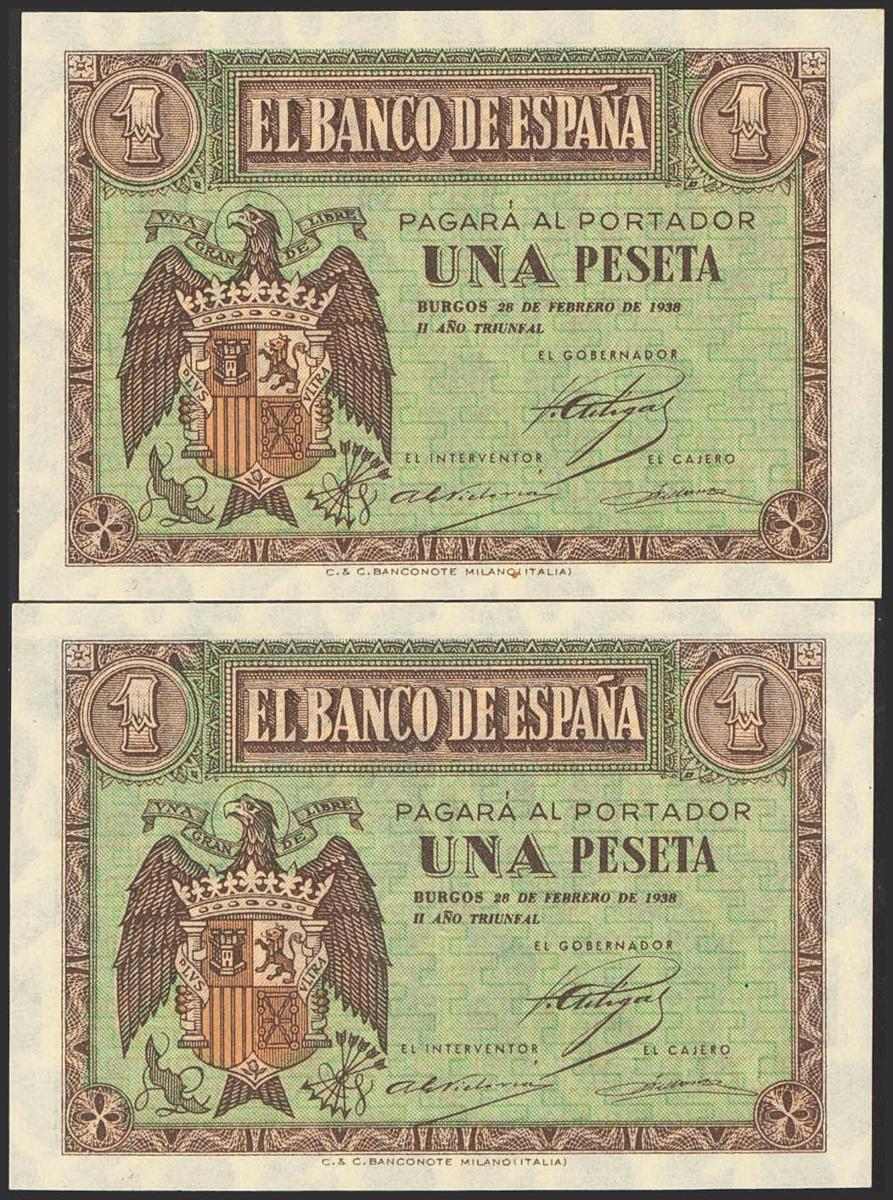 English 1 Peseta. February 28, 1938. Correlative pair. Series B. (Edifil 2023: 427a). It retains all its original appearance. Uncirculated.