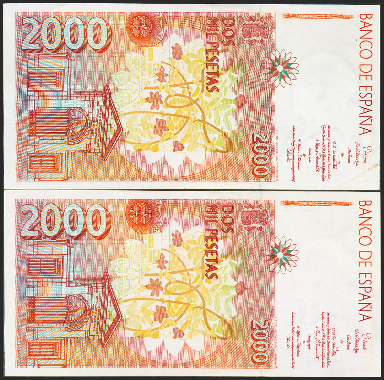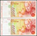 2000 Pesetas. April 24, 1992. Correlative pair. No series and very low numbering. (Edifil 2021: 482). Uncirculated--.