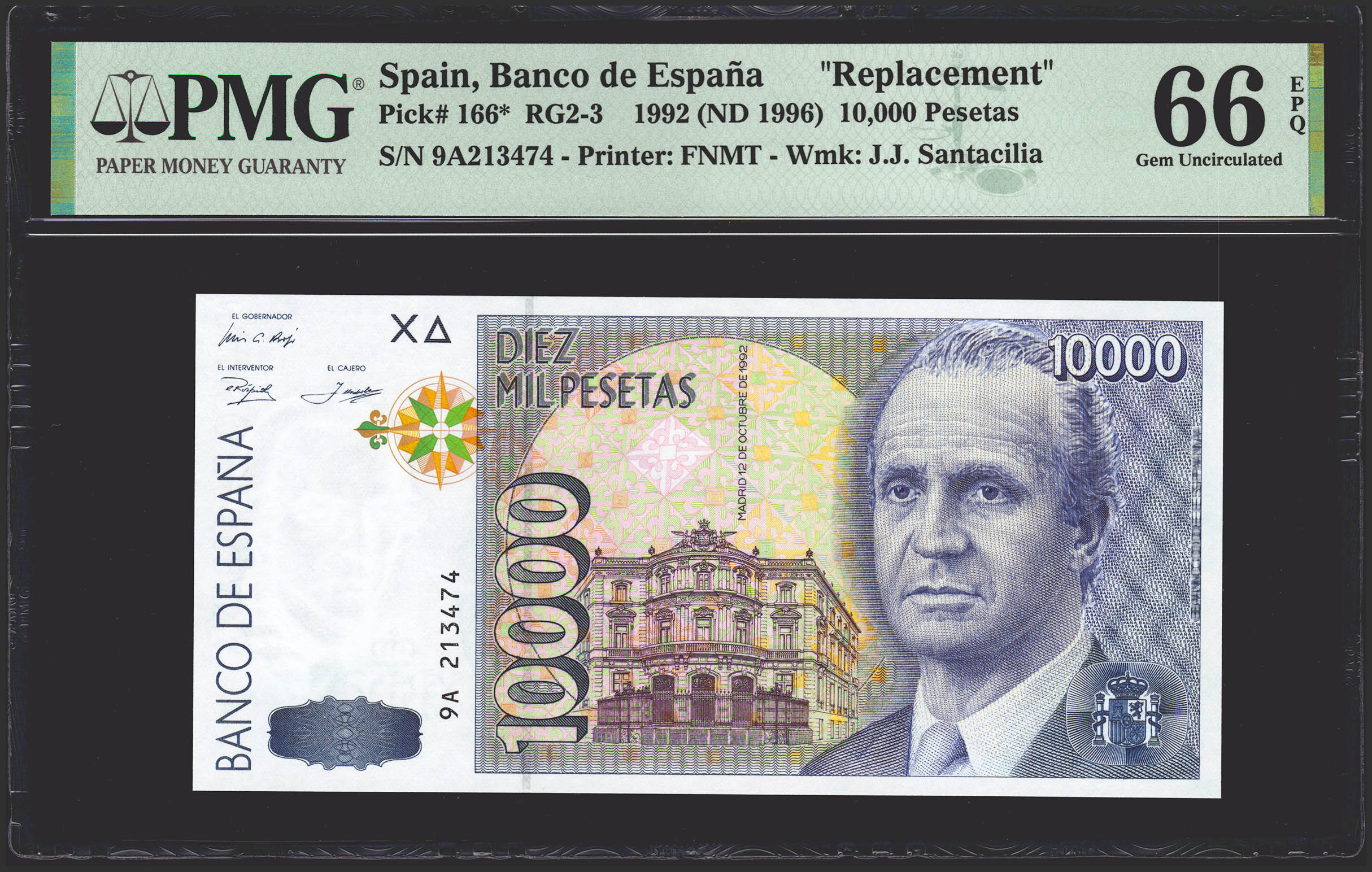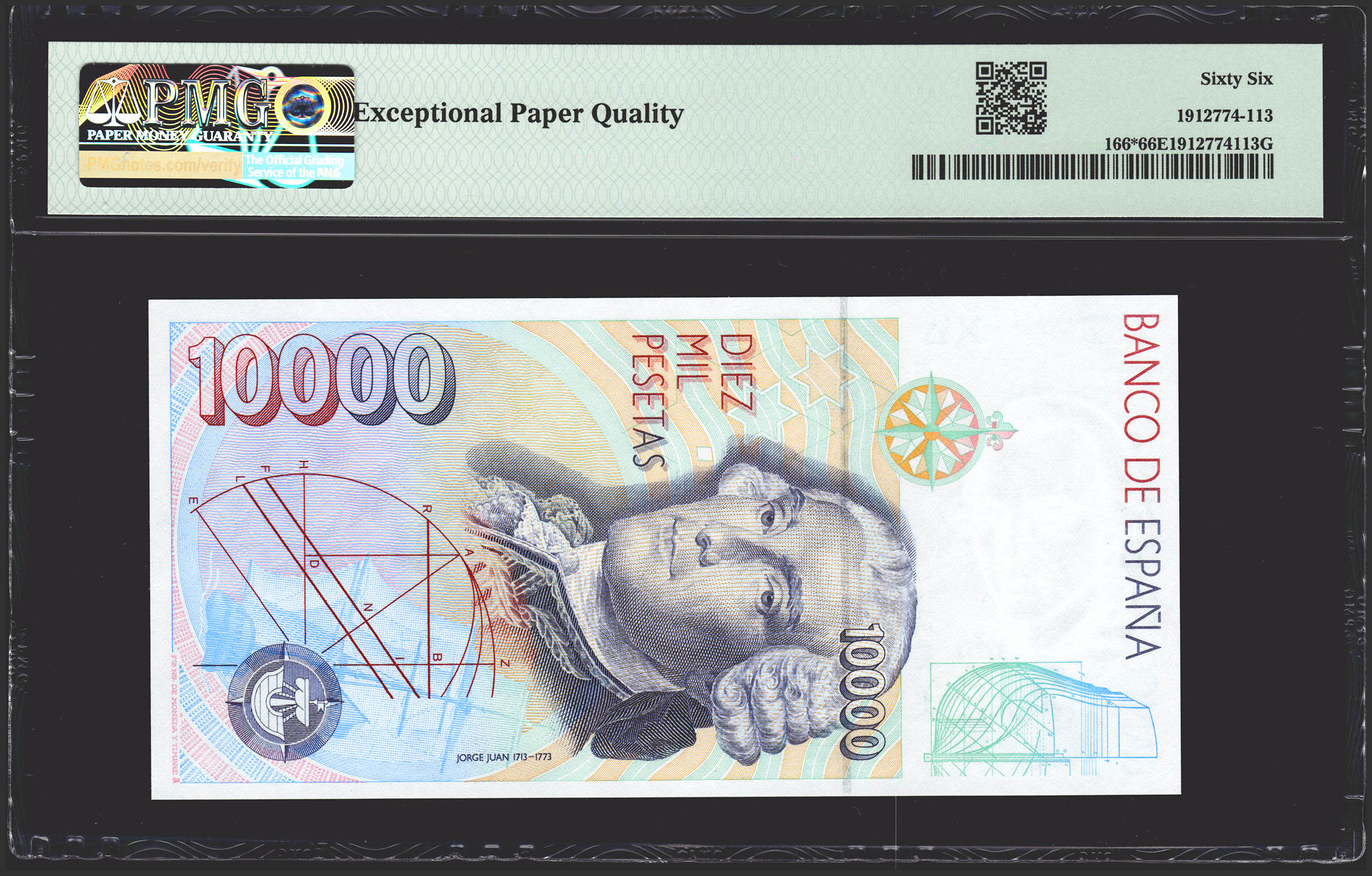 10,000 Pesetas. October 12, 1992. Special Series 9A. (Edifil 2021: 485b, Pick: 166*). Rare in this exceptional quality. Unused. Packaged PMG66EPQ.