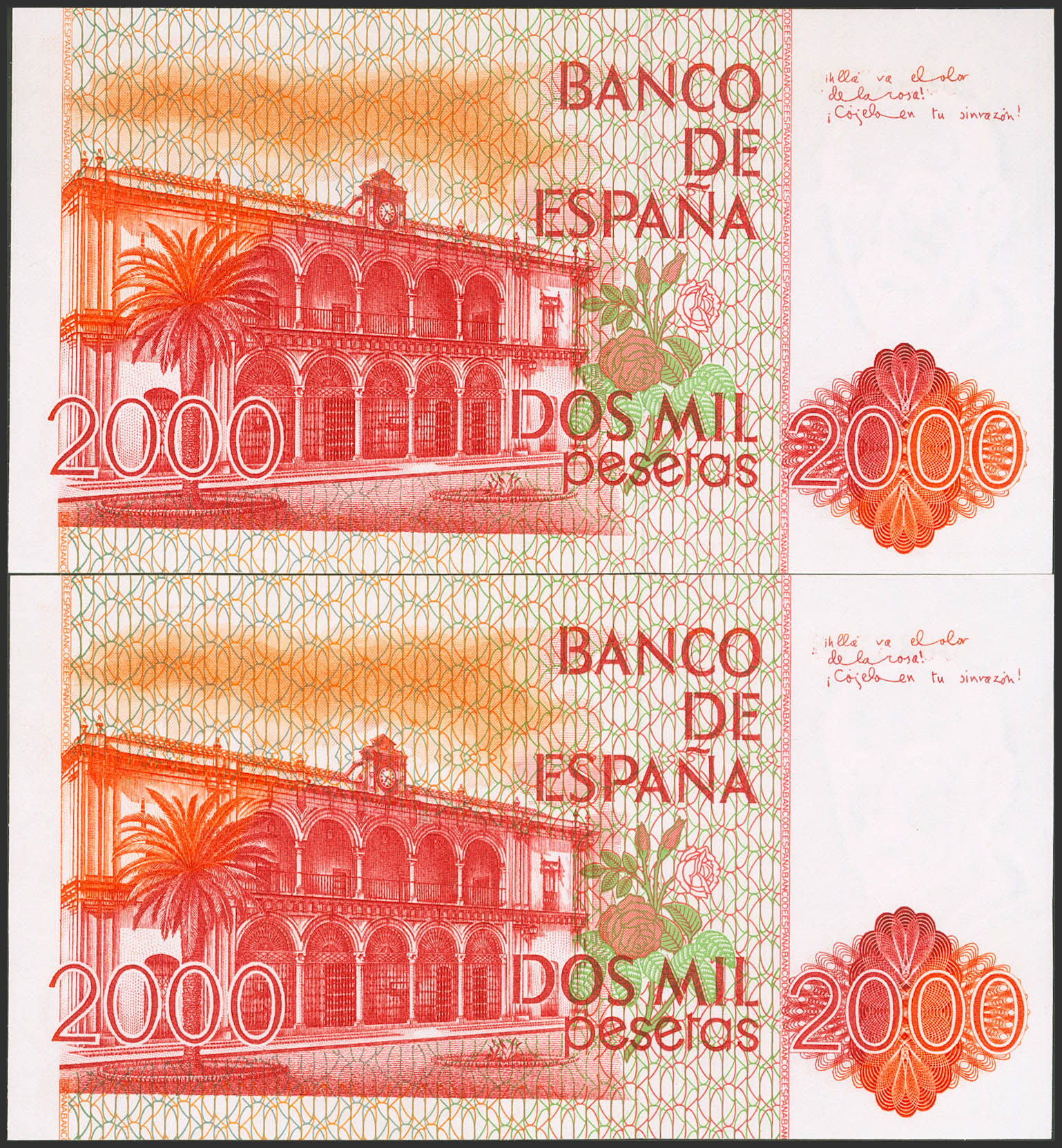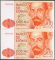 2000 Pesetas. July 22, 1980. Correlative pair and very low numbering. No series. (Edifil 2021: 479). Uncirculated.