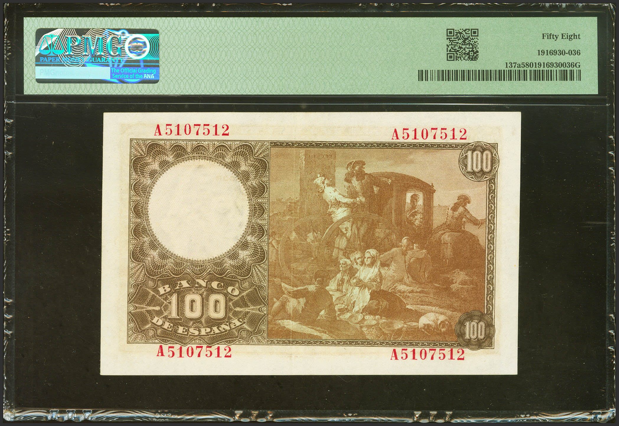 English 100 Pesetas. May 2, 1948. Series A. (Edifil 2023: 456a, Pick: 137a). Good Extremely Fine+. PMG58 encapsulation.