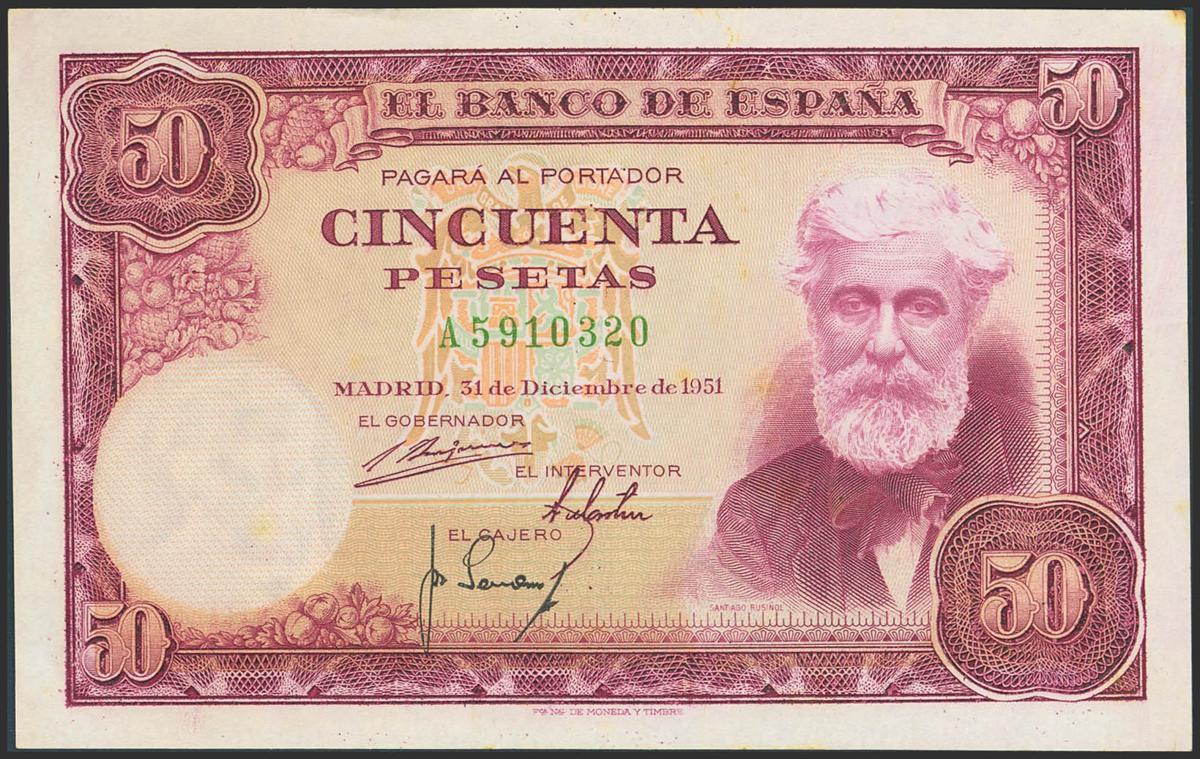 50 Pesetas. 31 de Diciembre de 1951. Serie A. (Edifil 2023: 462a). Conserva todo su apresto original, tonalizado. SC-.