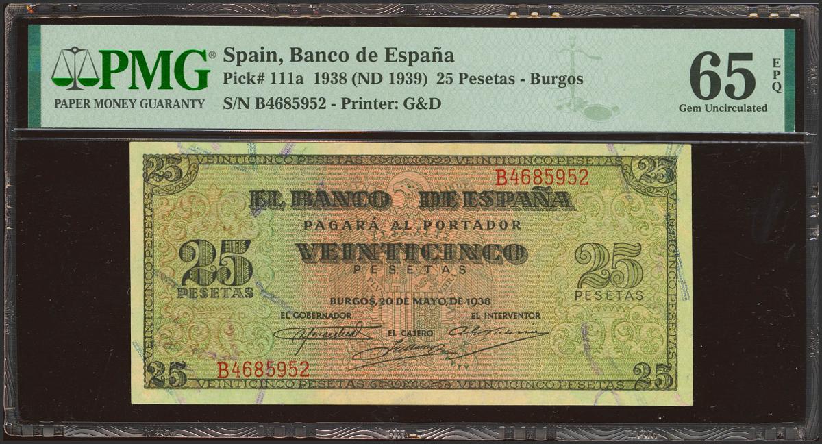25 Pesetas. 20 de Mayo de 1938. Serie B. (Edifil 2023: 430a, Pick: 111a). Inusual en esta calidad, apresto original. SC. Encapsulado PMG65EPQ.