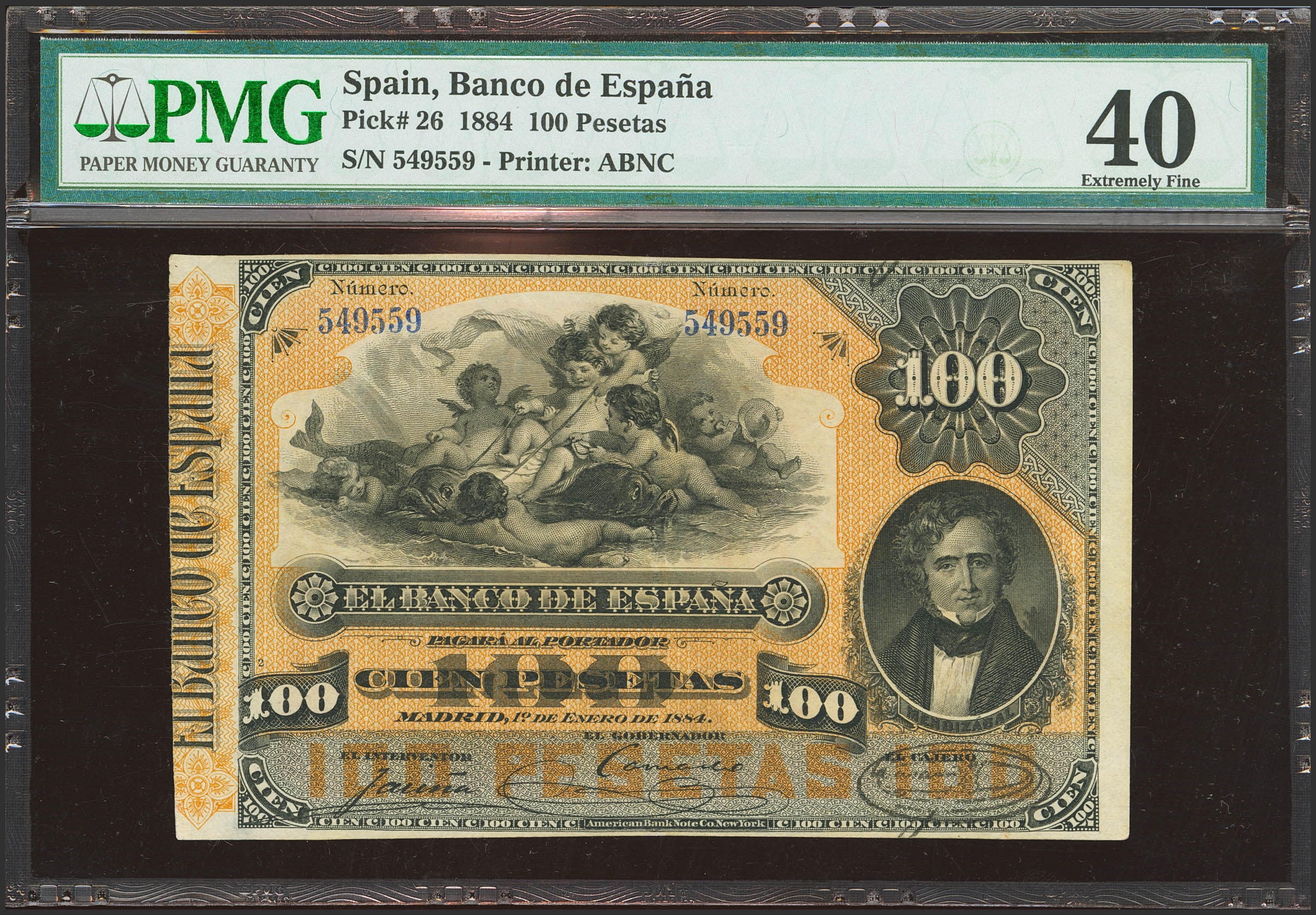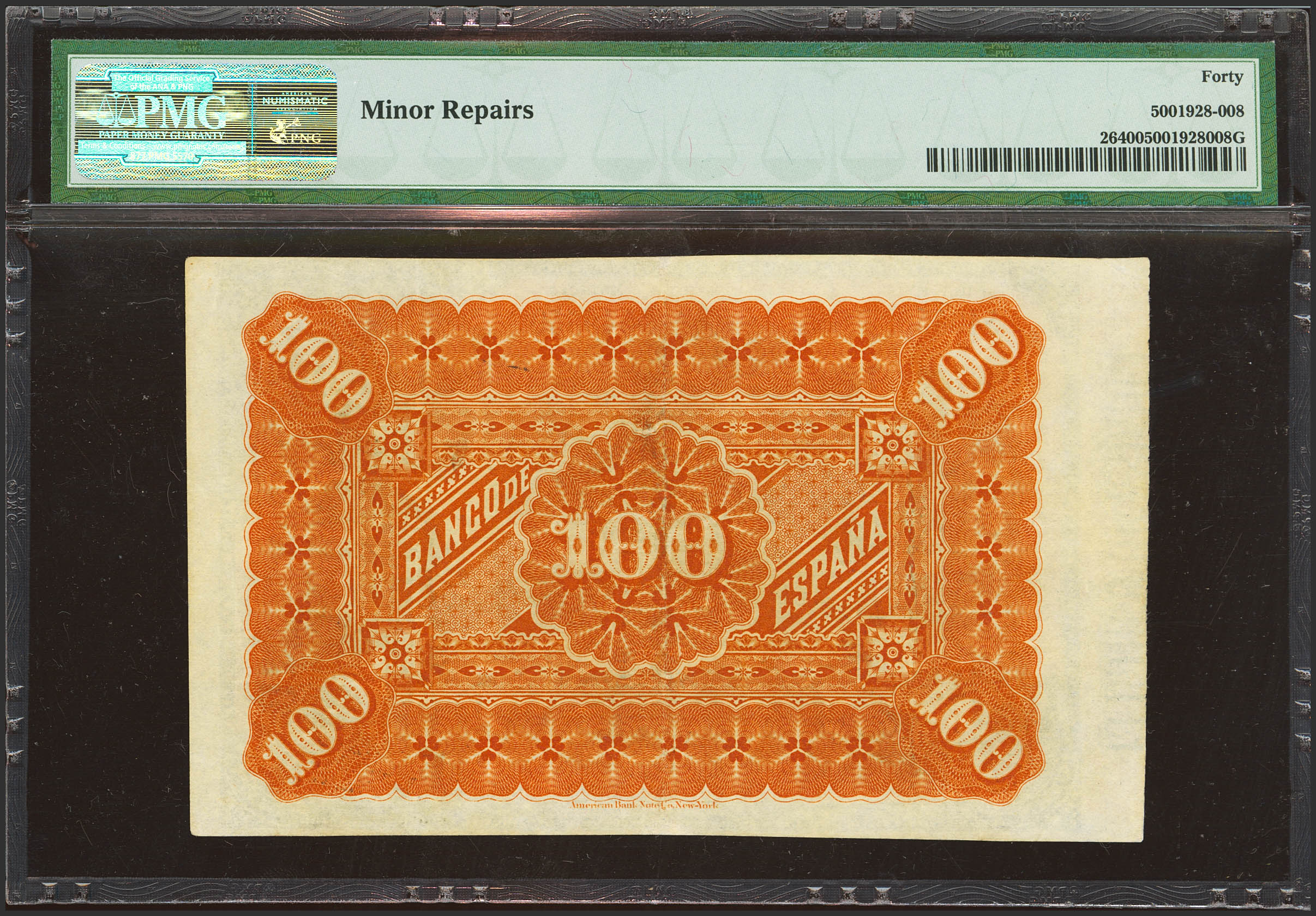 100 Pesetas. 1 de Enero de 1884. Sin serie. (Edifil 2023: 284, Pick: 26). Muy raro, en esta calidad y mÃnimamente reparado. MBC+. Encapsulado PMG40 (minor repairs)(para hacernos idea de la rareza, a fecha 1 de Diciembre de 2025, este billete es el segundo mejor calificado junto a otros dos billetes en PMG).