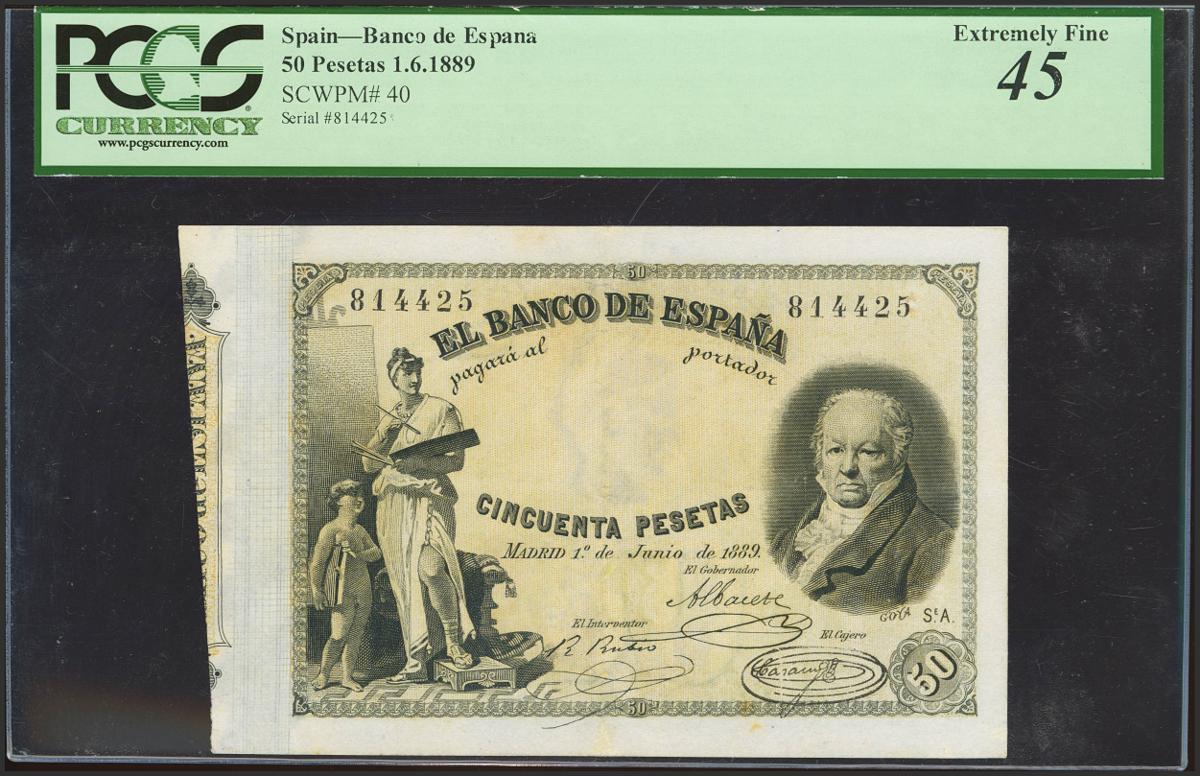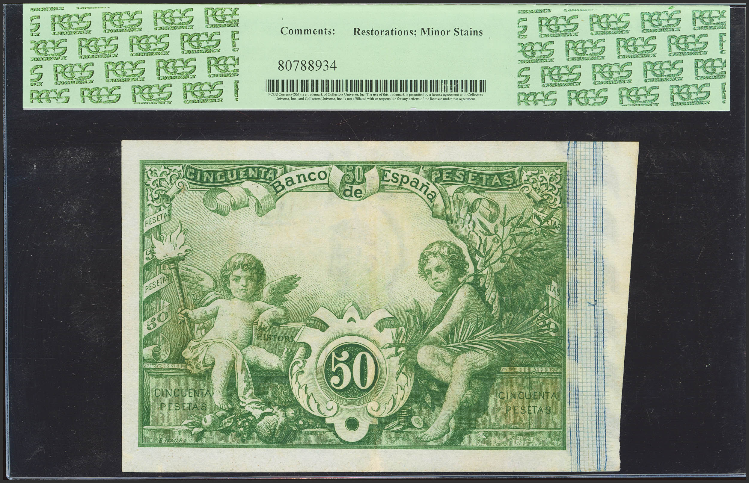 50 Pesetas. 1 de Junio de 1889. Serie A. (Edifil 2021: 298, Pick: 40). Muy raro, mínimamente reparado. EBC-. Encapsulado PCGS45 (restorations, minor stains).