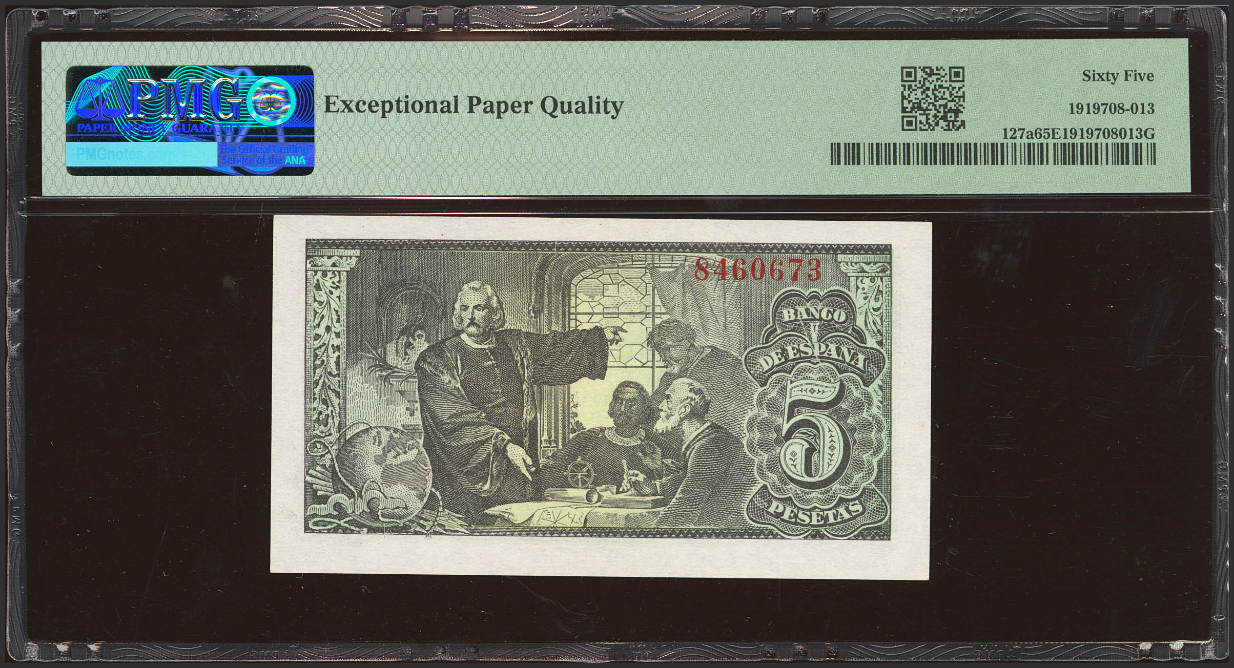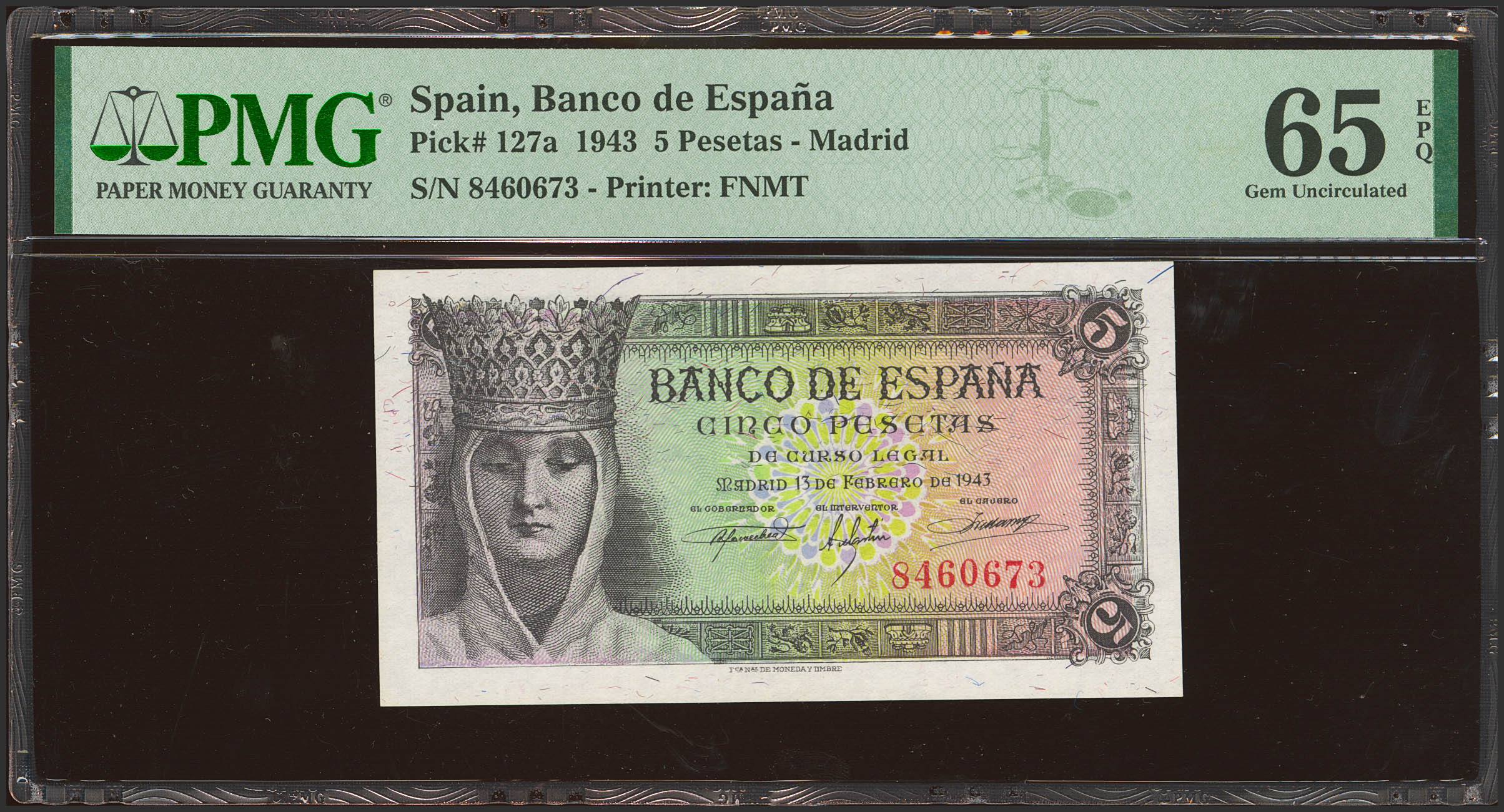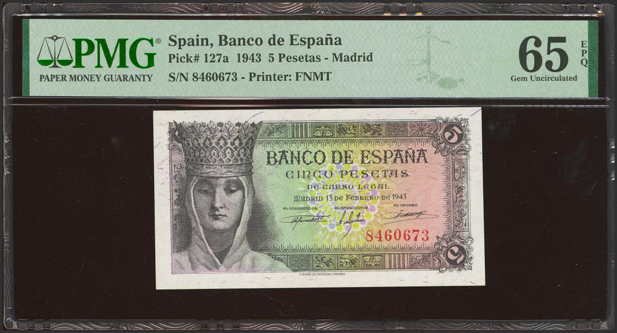 5 Pesetas. 13 de Febrero de 1943. Sin serie. (Edifil 2021: 446, Pick: 127a). Inusual en esta excepcional calidad, apresto original. SC. Encapsulado PMG65EPQ.