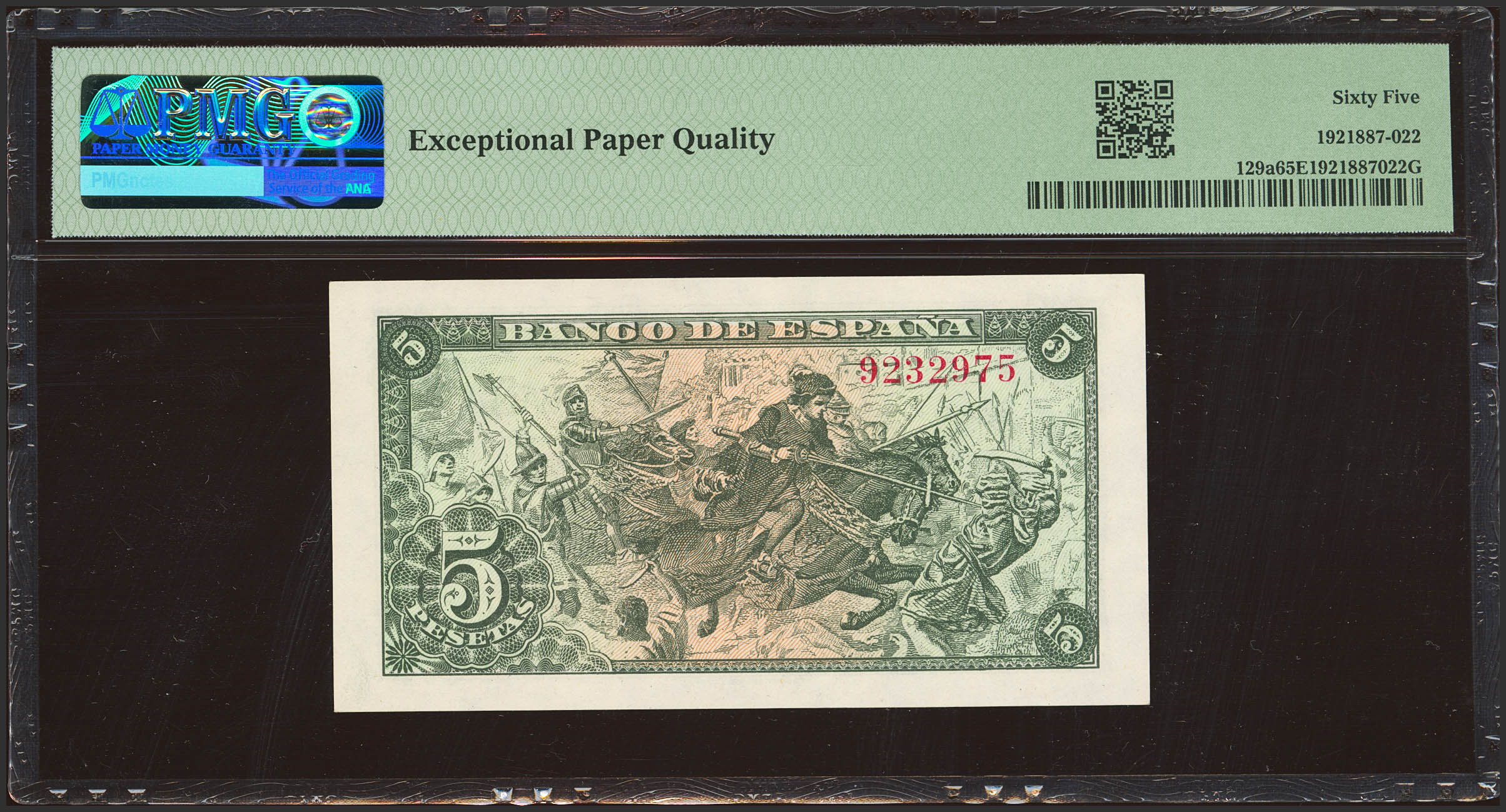 5 Pesetas. 15 de Junio de 1945. Sin serie. (Edifil 2023: 449, Pick: 129a). Inusual en esta calidad, apresto original. SC. Encapsulado PMG65EPQ.
