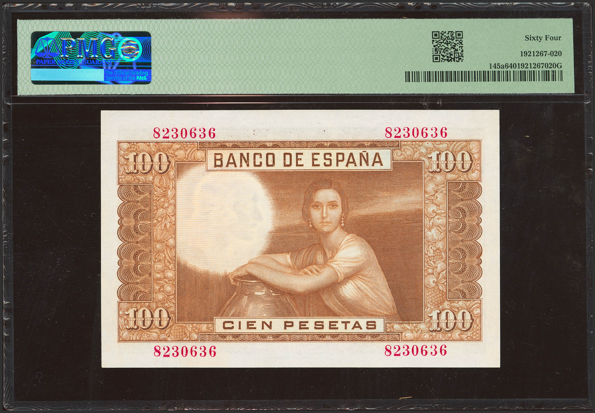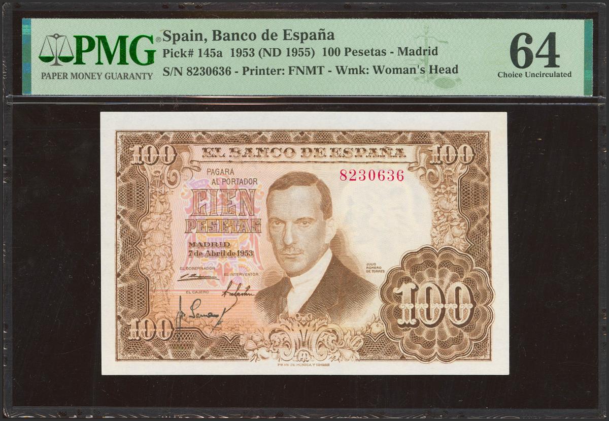 100 Pesetas. 7 de Abril de 1953. Sin serie. (Edifil 2023: 464, Pick: 145a). Inusual en esta excepcional calidad. SC. Encapsulado PMG64.