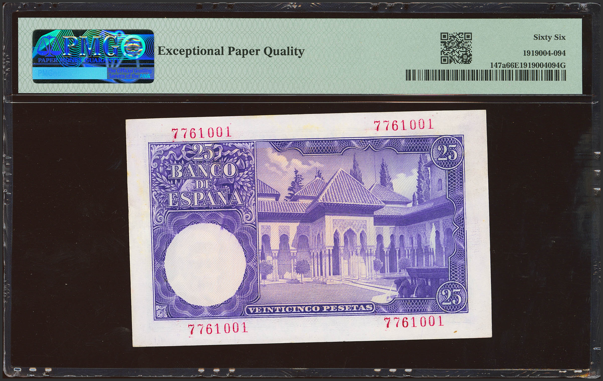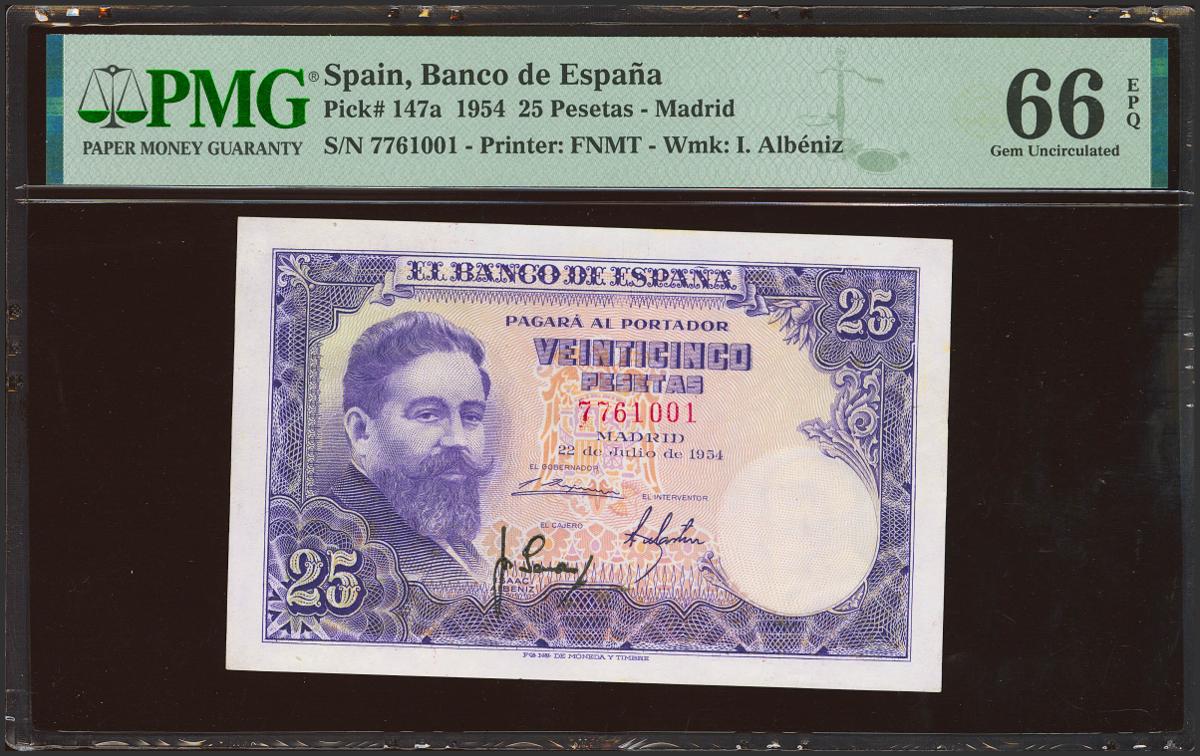 25 Pesetas. 22 de Julio de 1954. Sin serie. (Edifil 2023: 467, Pick: 147a). Rarísimo en esta excepcional calidad, conserva todo su apresto original. SC. Encapsulado PMG66EPQ.