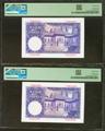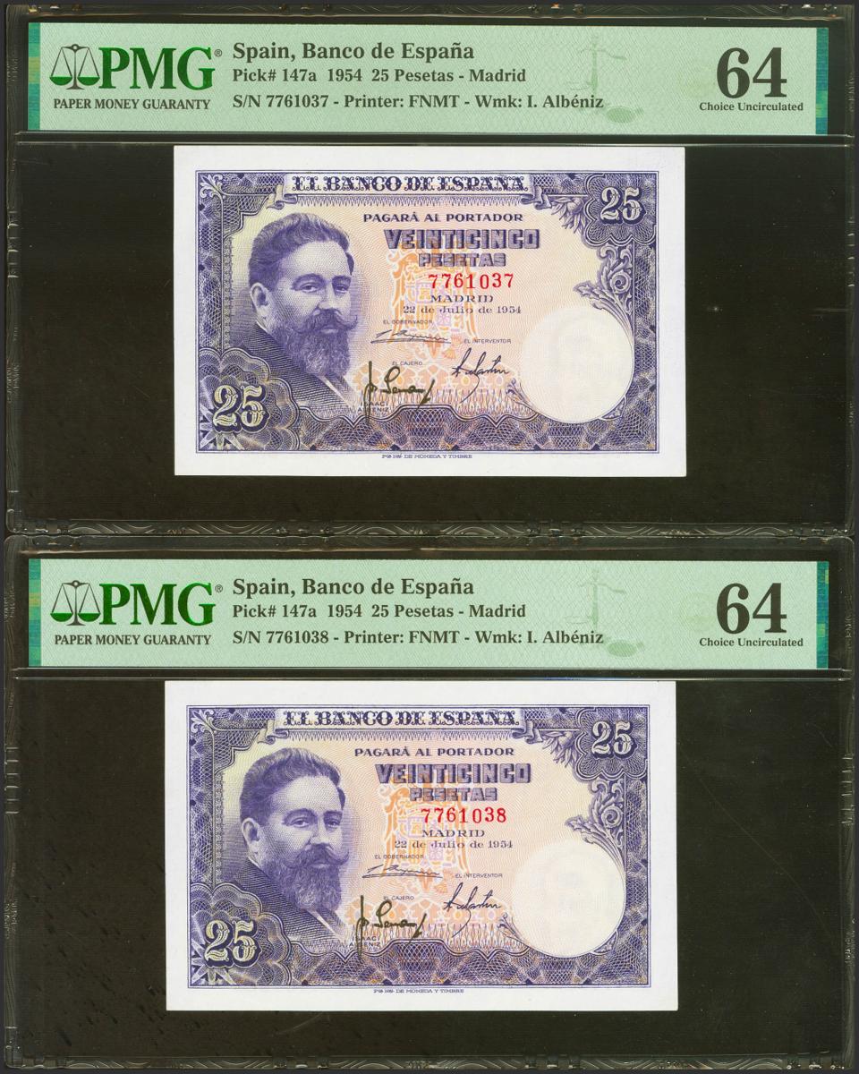 25 Pesetas. 22 de Julio de 1954. Pareja correlativa. Sin serie. (Edifil 2023: 467, Pick: 147a). Inusual. SC. Encapsulados PMG64, ambos.