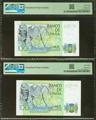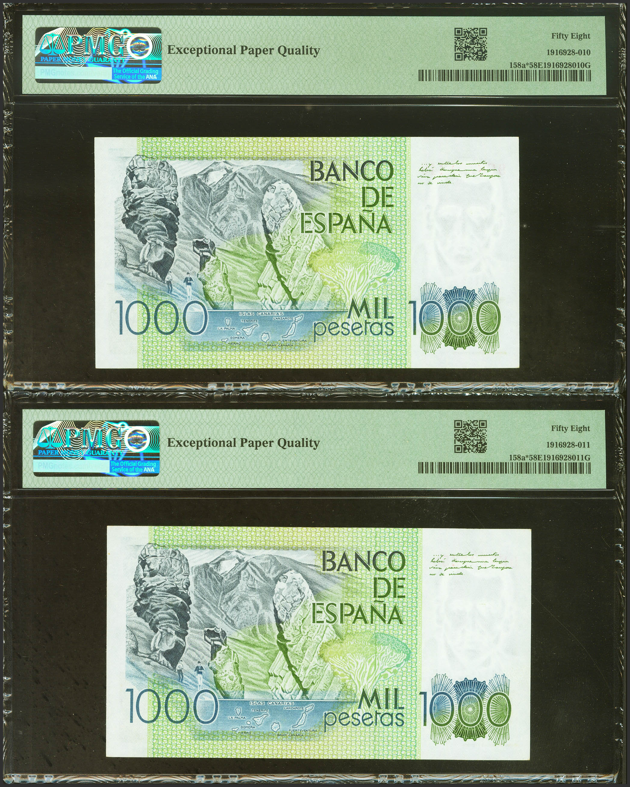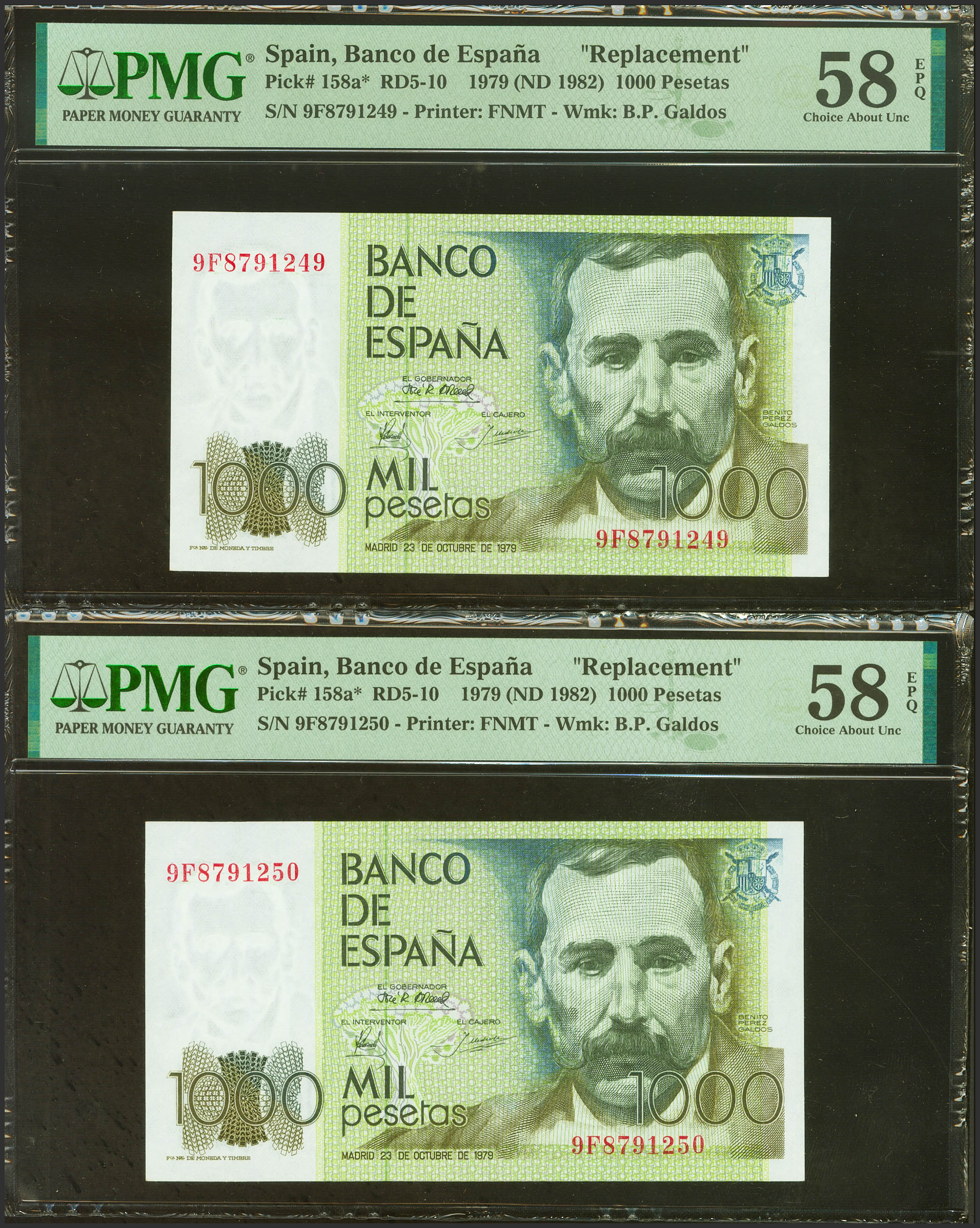 1000 Pesetas. 23 de Octubre de 1979. Pareja correlativa. Serie especial 9F. (Edifil 2023: 477b, Pick: 158a*). Inusual, apresto original. EBC+++. Encapsulados PMG58EPQ, ambos.
