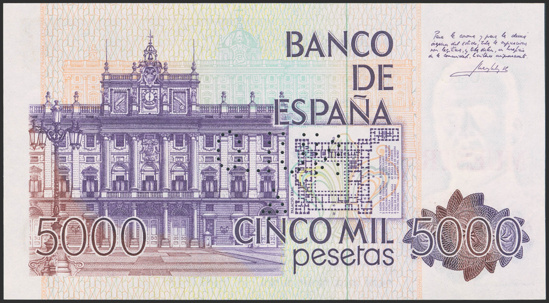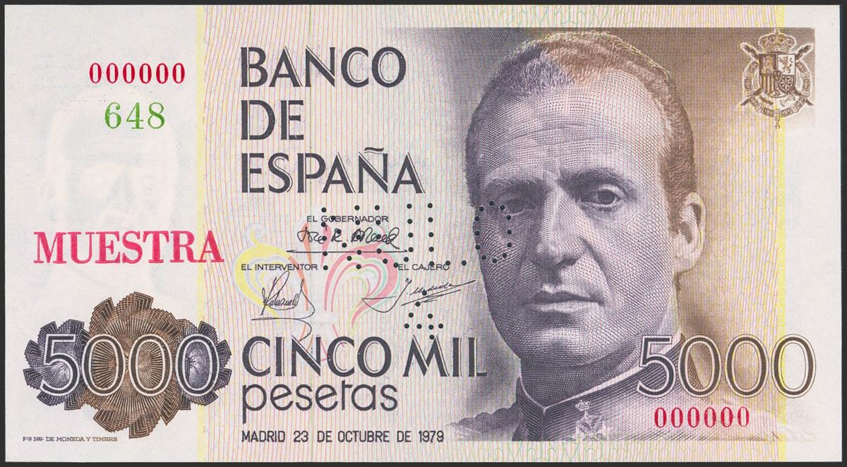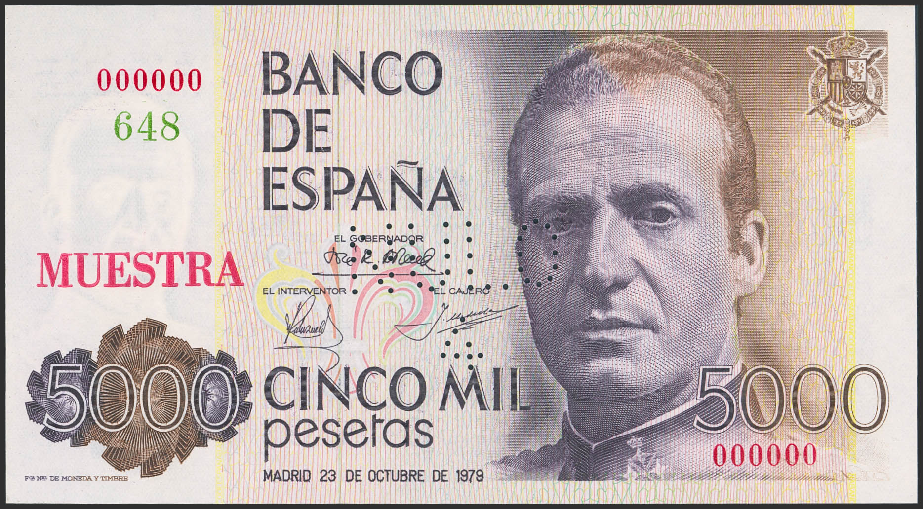 5000 Pesetas. 23 de Octubre de 1979. Sin serie. MUESTRA, serie 648, en verde y numeración 000000 con perforación "NULO 4". (Edifil 2023: 478M). Raro. SC.