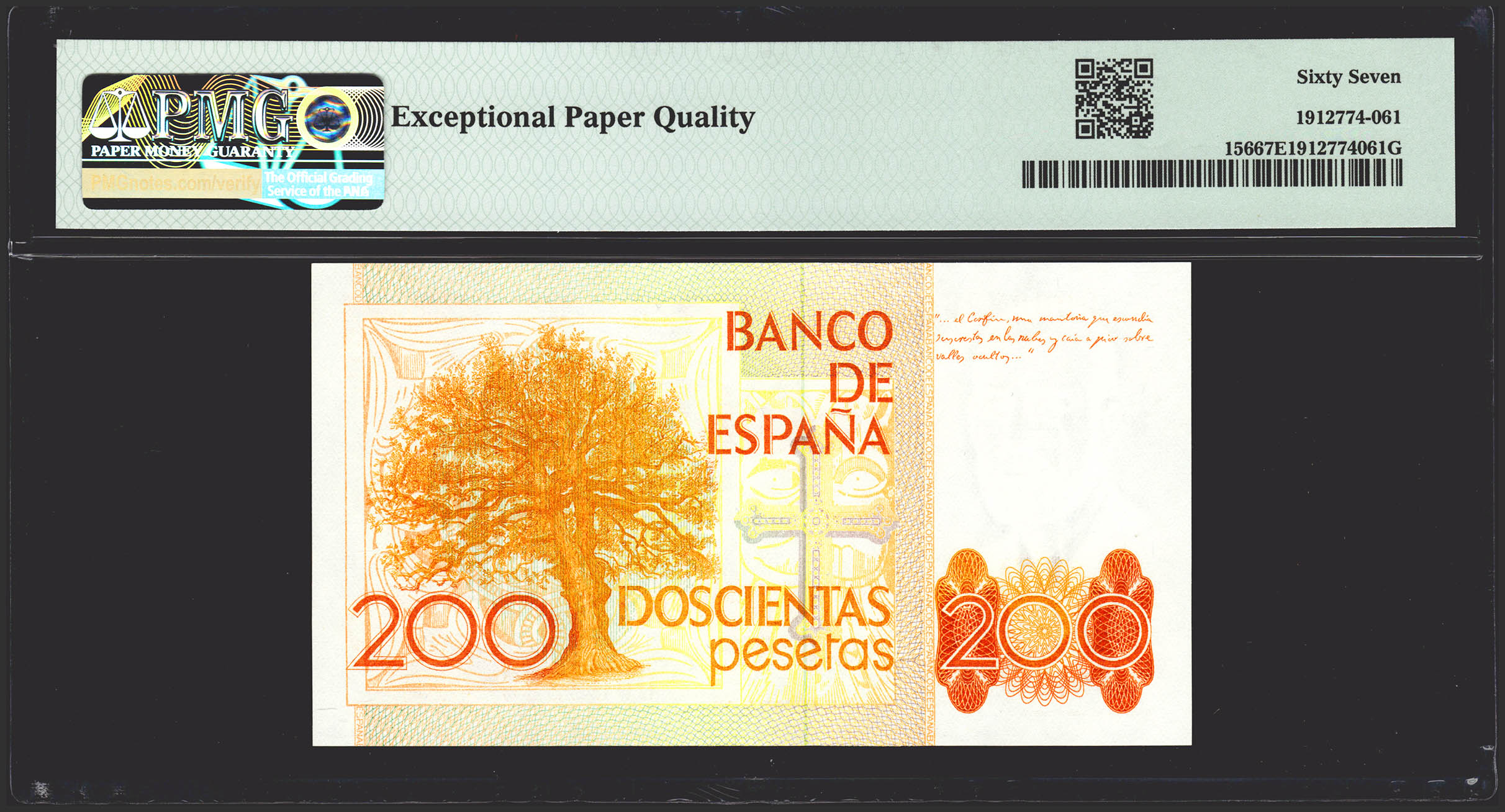 200 Pesetas. 16 de Septiembre de 1980. Sin serie y numeración bajÃsima. (Edifil 2021: 480, Pick: 156). Raro. SC. Encapsulado PMG67EPQ.