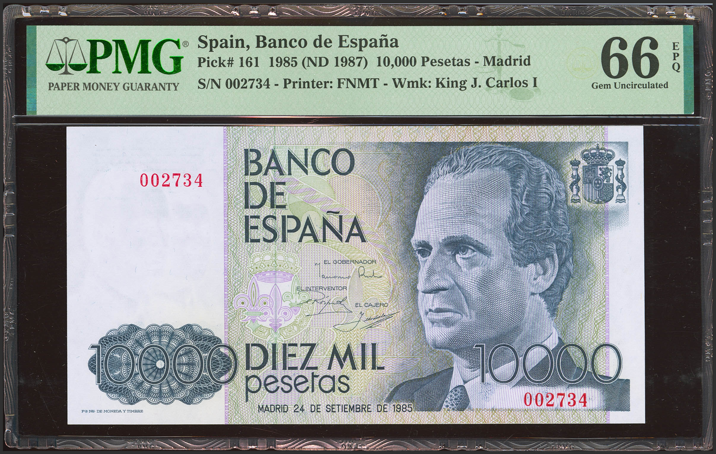 10000 Pesetas. 24 de Septiembre de 1985. Sin serie y bajísima numeración. (Edifil 2023: 481, Pick: 161). Inusual en esta excepcional calidad. SC. Encapsulado PMG66EPQ.