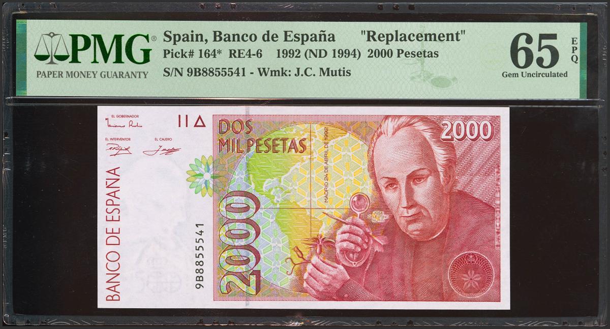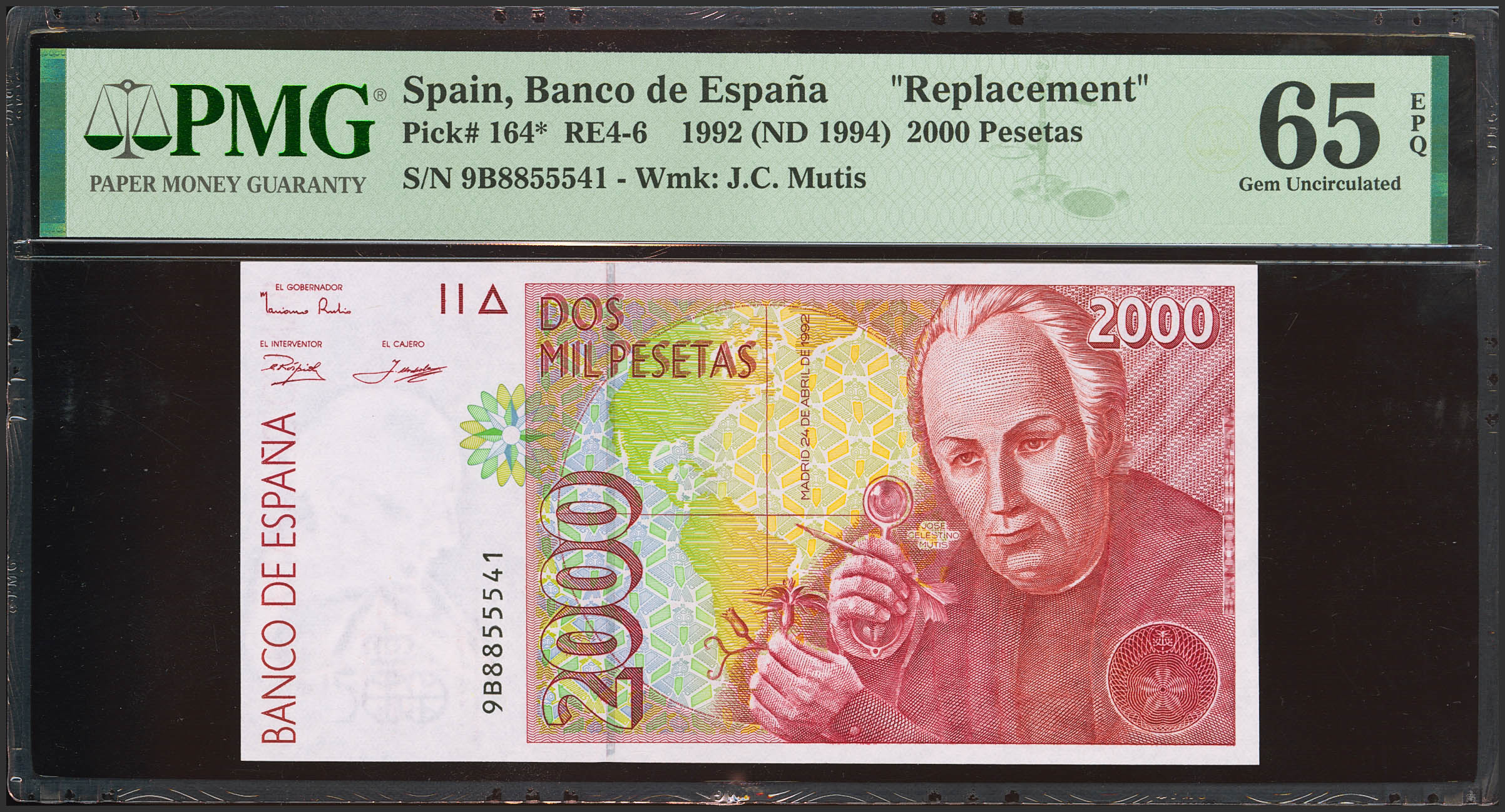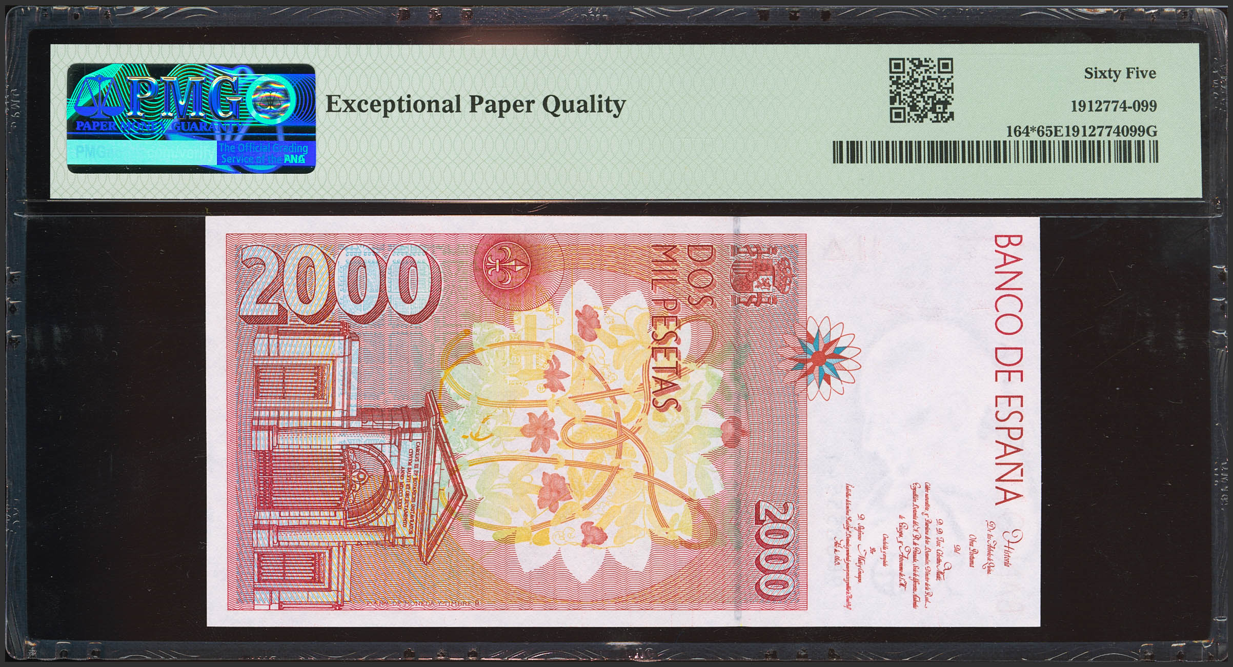 2000 Pesetas. April 24, 1992. Special Series 9B. (Edifil 2021: 482Ab, Pick: 164*). Unusual in this grade. Uncirculated. PMG65EPQ capsule.