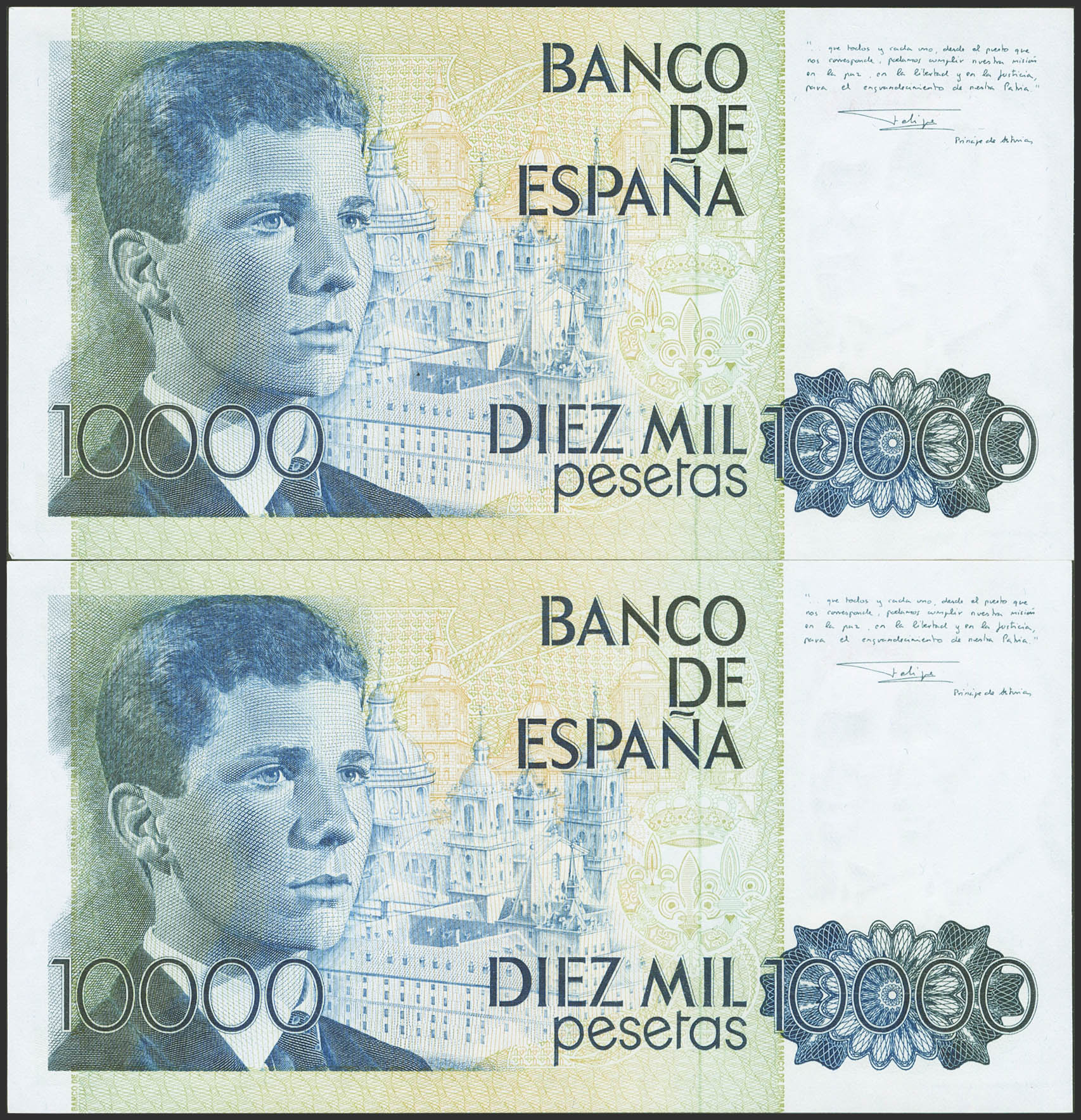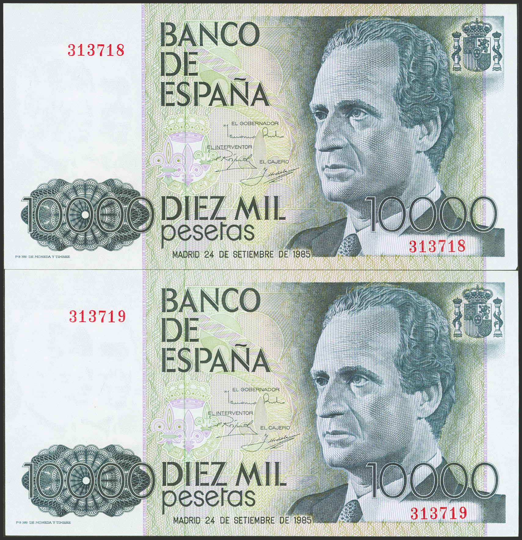 10,000 Pesetas. September 24, 1985. Consecutive pair. No series. (Edifil 2021: 481). Uncirculated--.