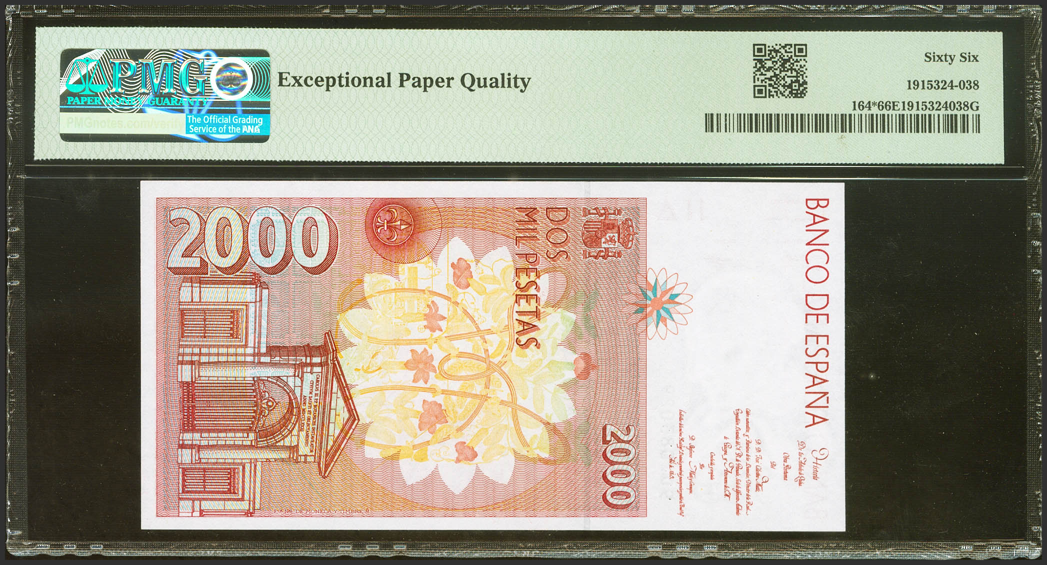 2000 Pesetas. April 24, 1992. Special Series 9D. (Edifil 2023: 482Ae, Pick: 164*). Rare in this exceptional condition. Uncirculated. Packaged in PMG66EPQ.