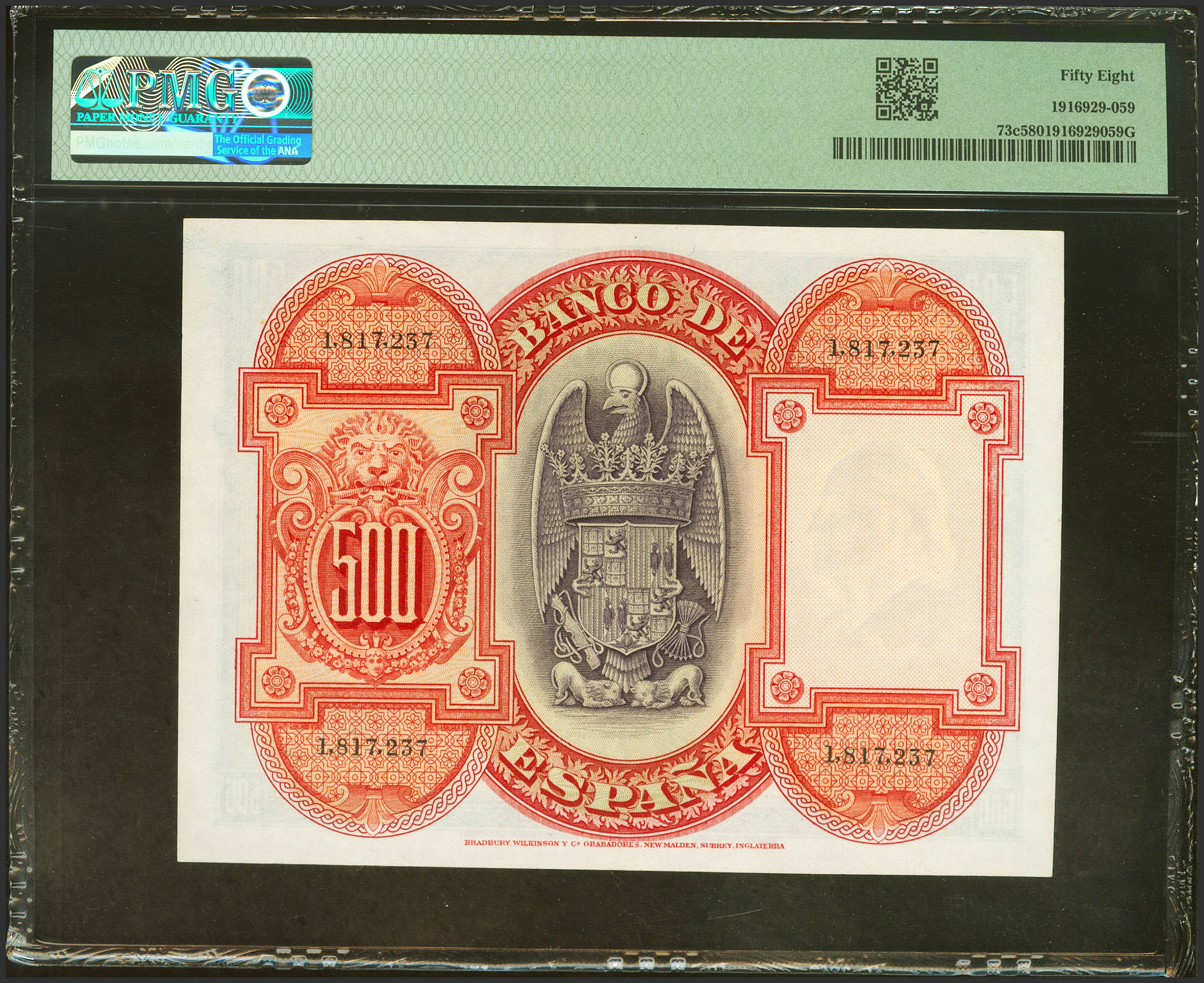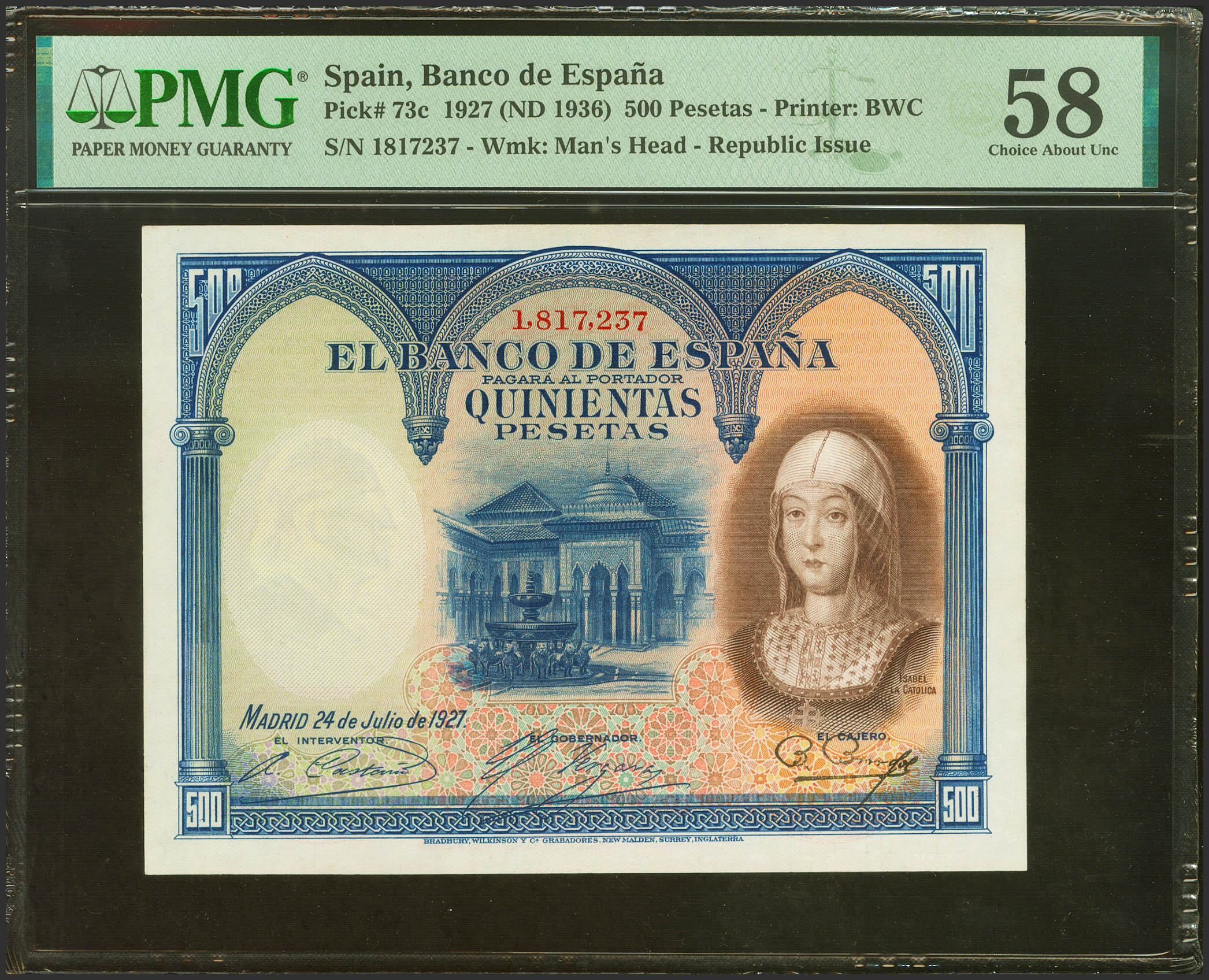 500 Pesetas. July 24, 1927. No serial number after 1602000. (Edifil 2023: 352, Pick: 73c). Unusual in this condition. Good Extremely Fine+. PMG58 package.