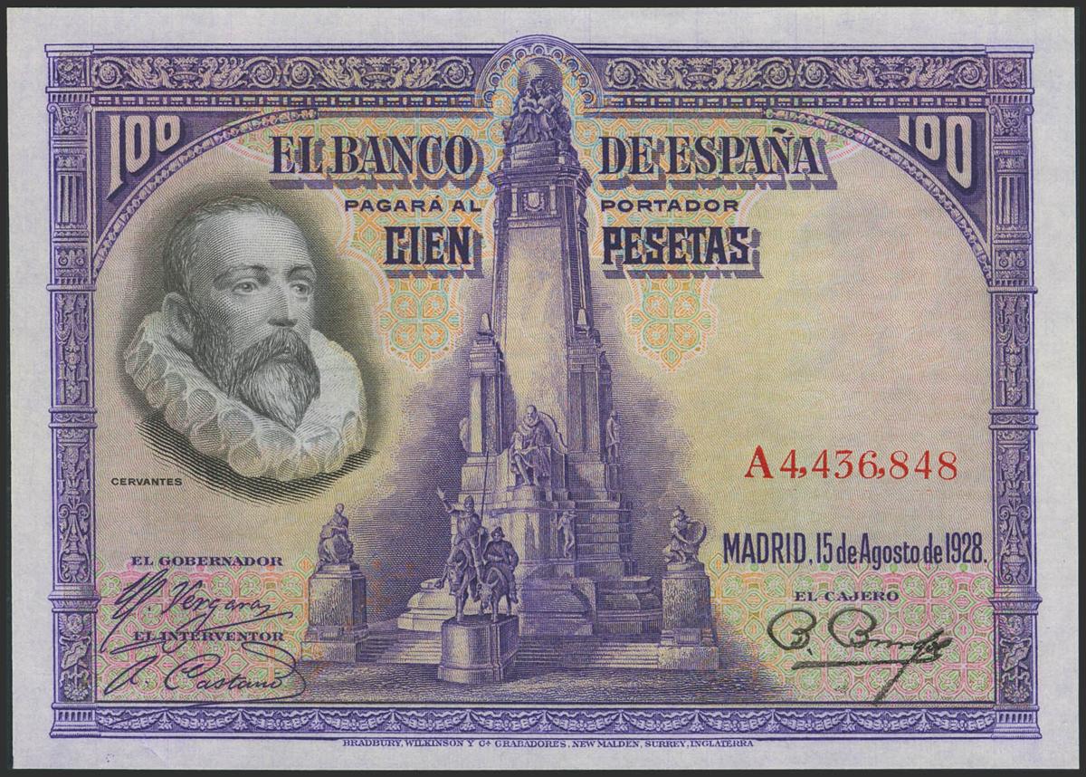 English 100 Pesetas. August 15, 1928. Series A. (Edifil 2023: 355a). Retains all its original finish. Uncirculated-.