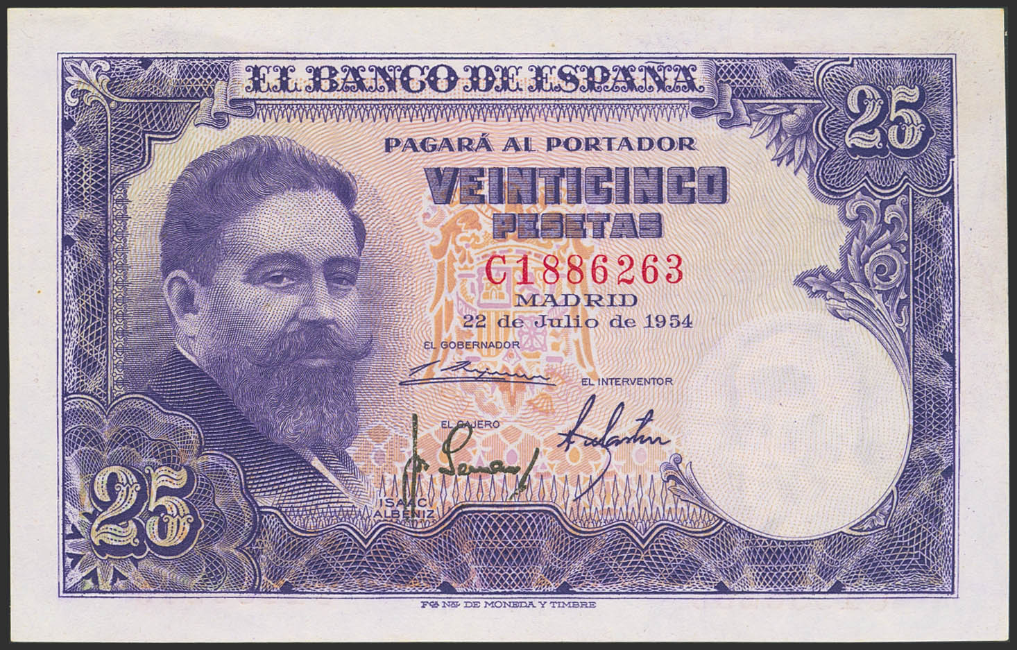25 Pesetas. July 22, 1954. Series C. (Edifil 2023: 467a). Original finish. Uncirculated-.