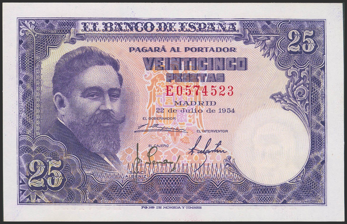 25 Pesetas. July 22, 1954. Series E. (Edifil 2023: 467a). Original finish. Uncirculated.