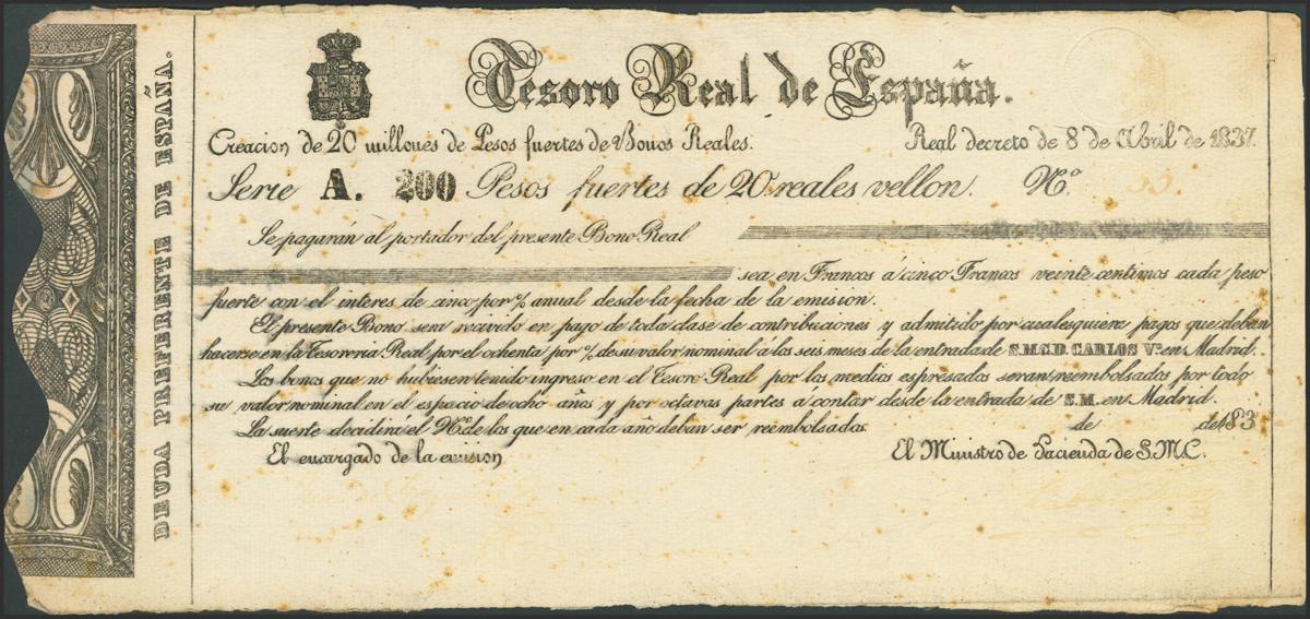 200 Pesos Fuertes of 20 Reales de Vellón. Royal Treasury of Spain. April 8, 1837. Series A. (Edifil 2023: 23). Minor foxing. Rare. Extremely Fine.