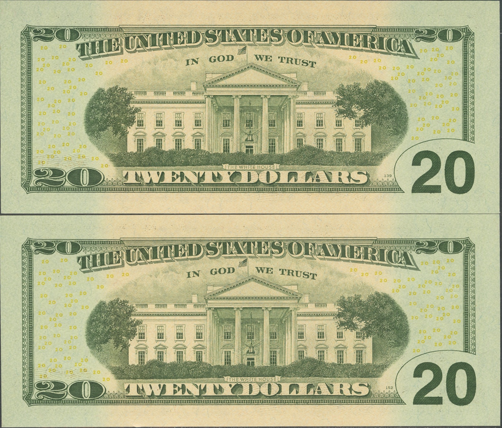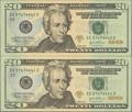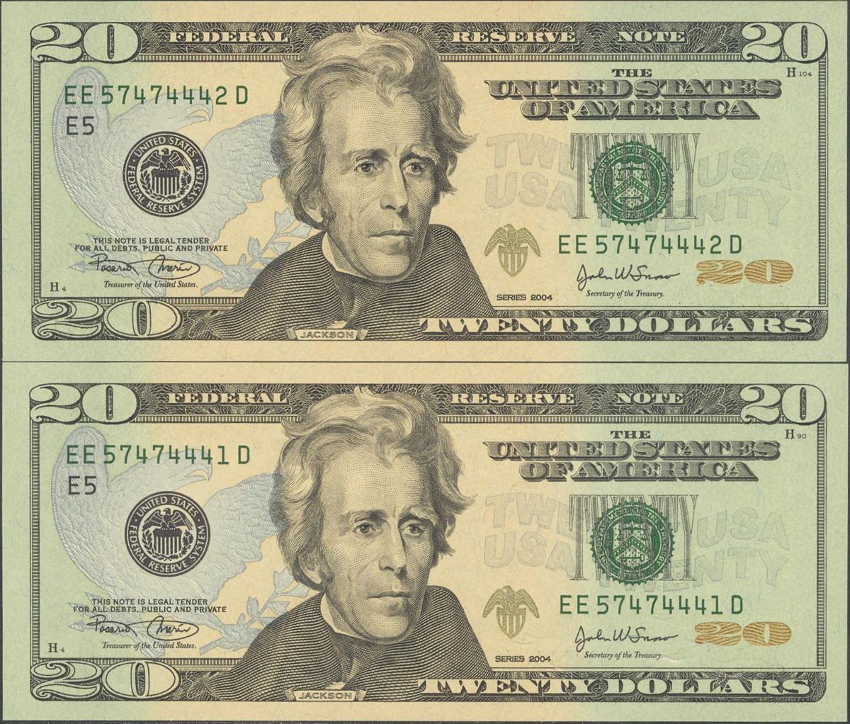 USES. 20 dollars. Federal Reserve Note. Richmond. Correlative pair. Serial number EE-D. 2004. (Friedberg: 2089E, Pick: 521A). Uncirculated.