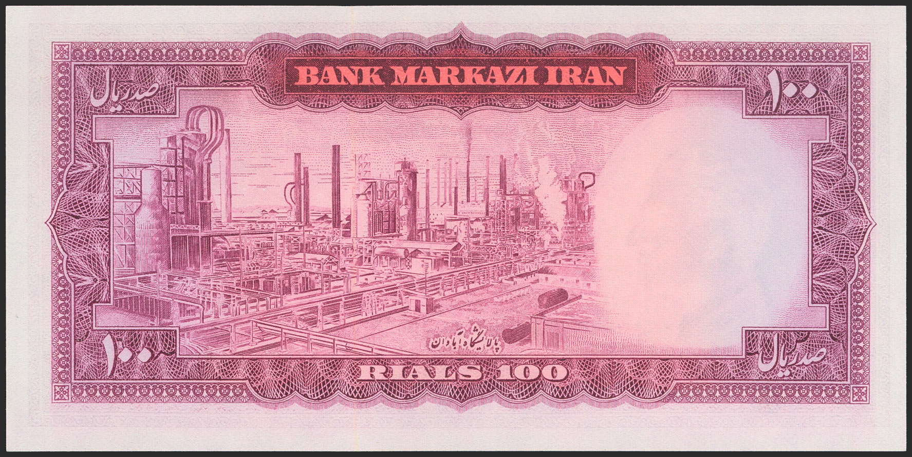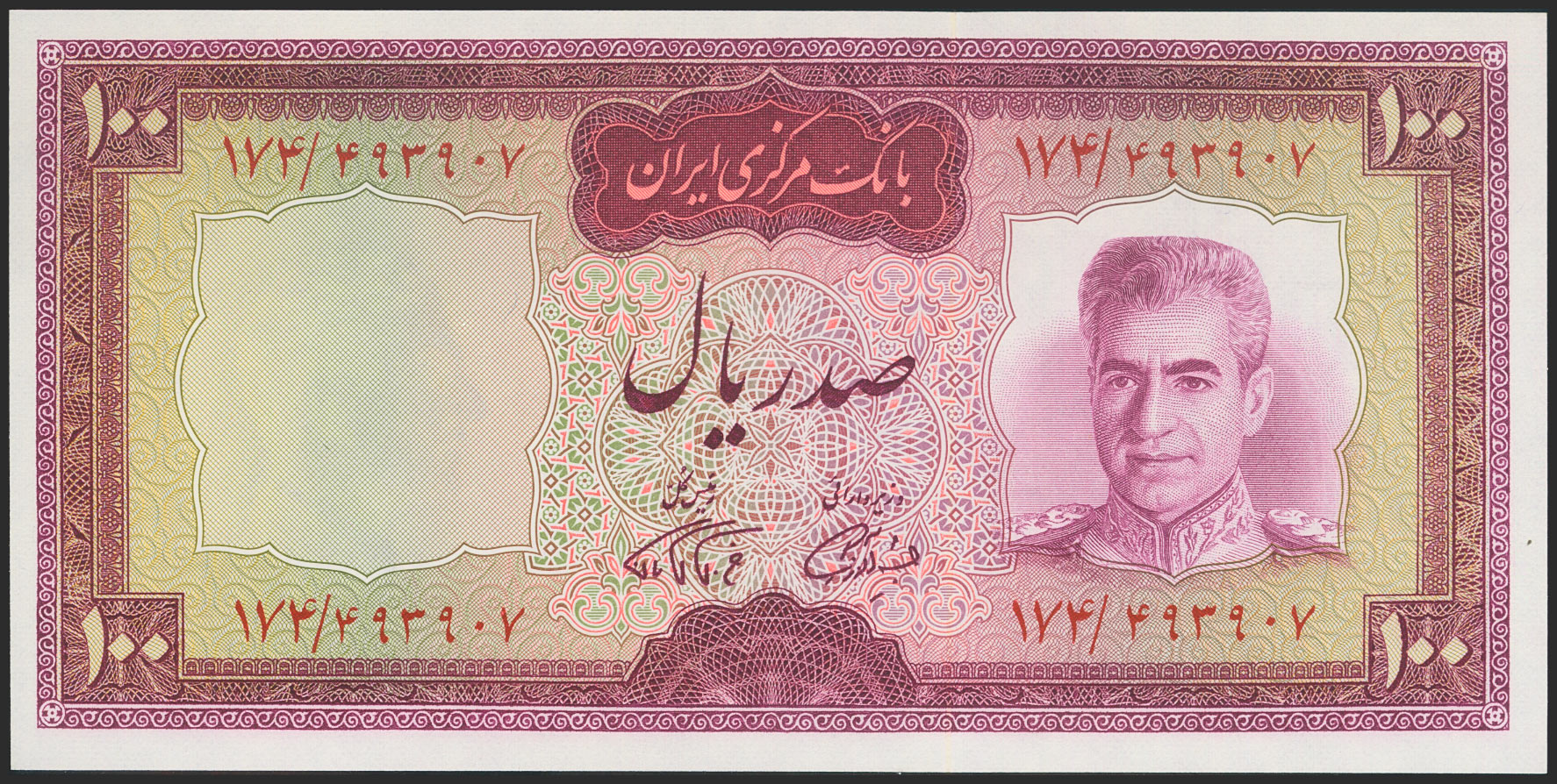 IRAN. 100 Rials. (1969ca). National Bank. Signatures: Famanfarmaian and Amouzegar, dark panel. (Pick: 86b). Uncirculated.
