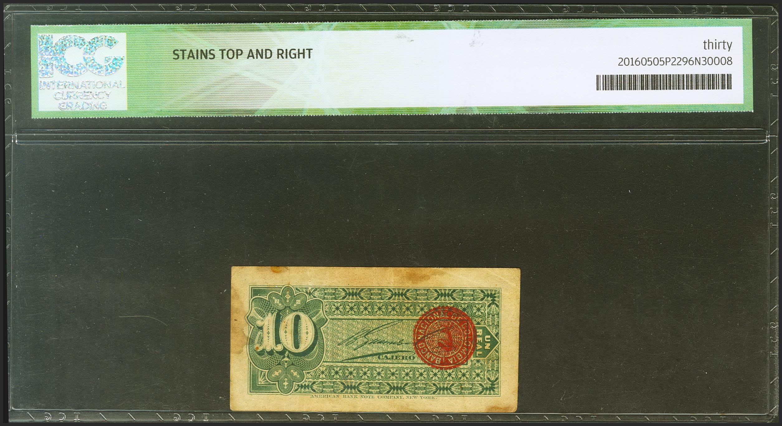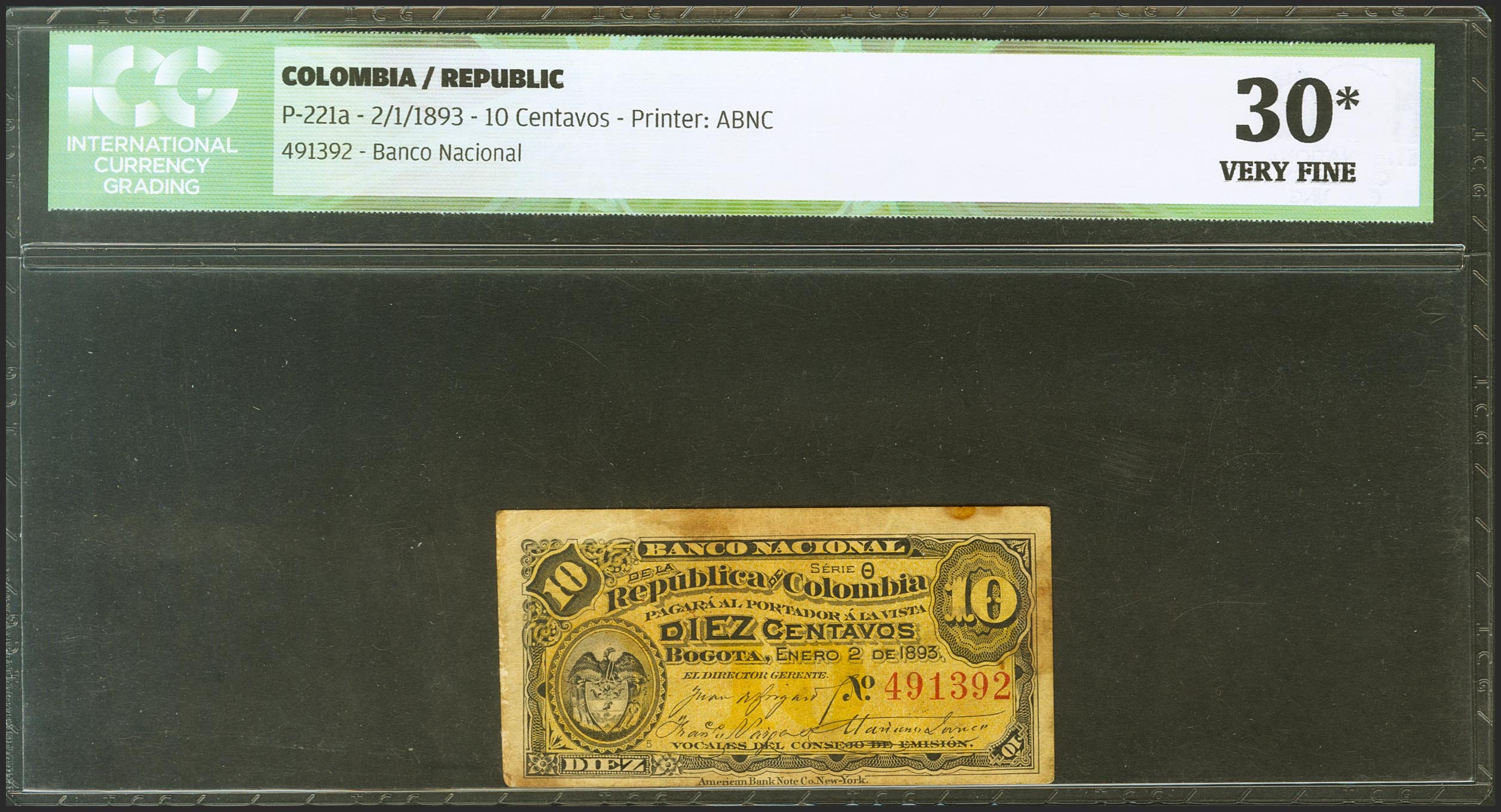 COLOMBIA. 10 cents. 2 January 1893. (Pick: 221a). ICG30*(Stains top and right).