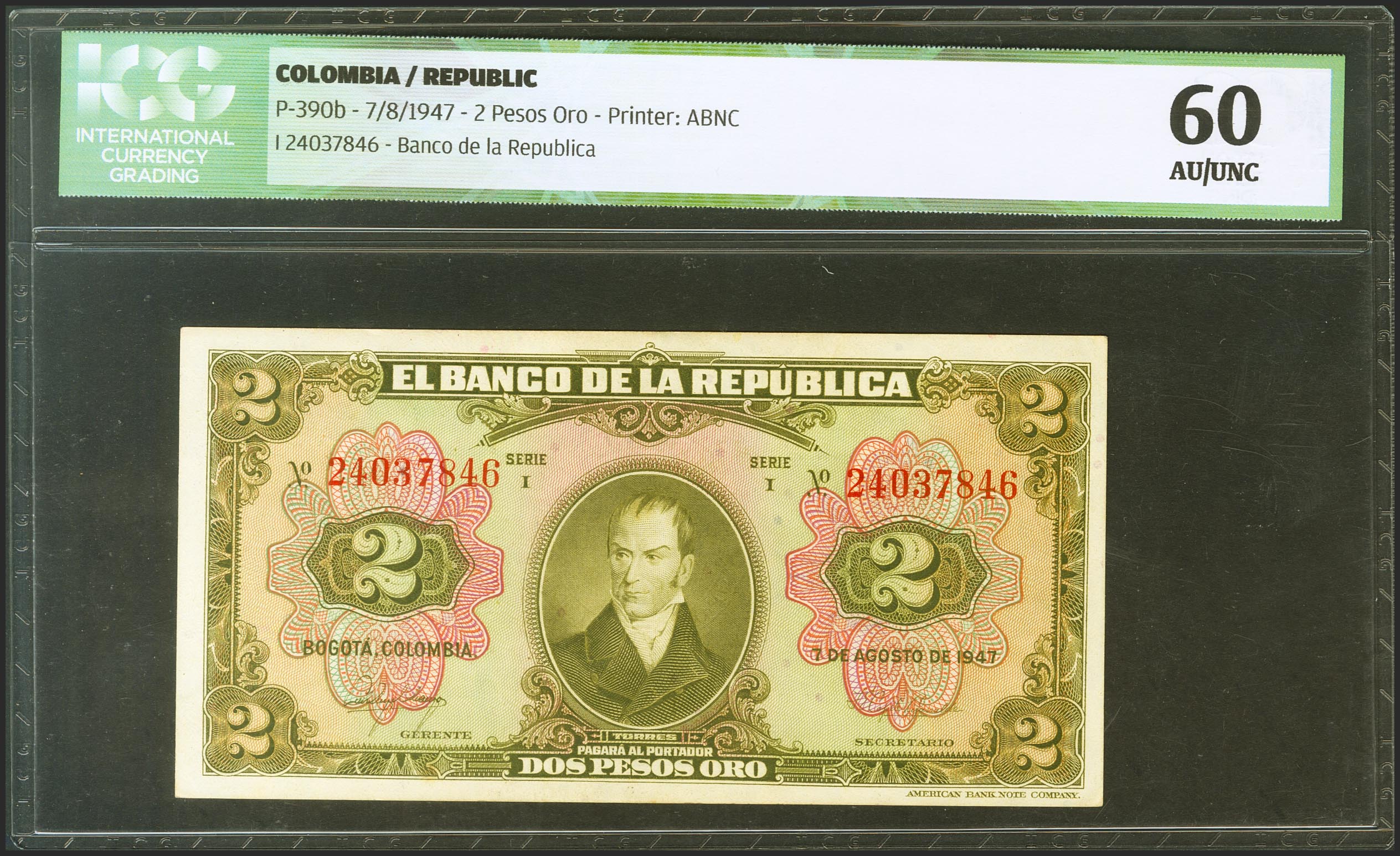 COLOMBIA. 2 Pesos Gold. August 7, 1947. Series I. (Pick: 390b). ICG60.