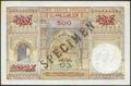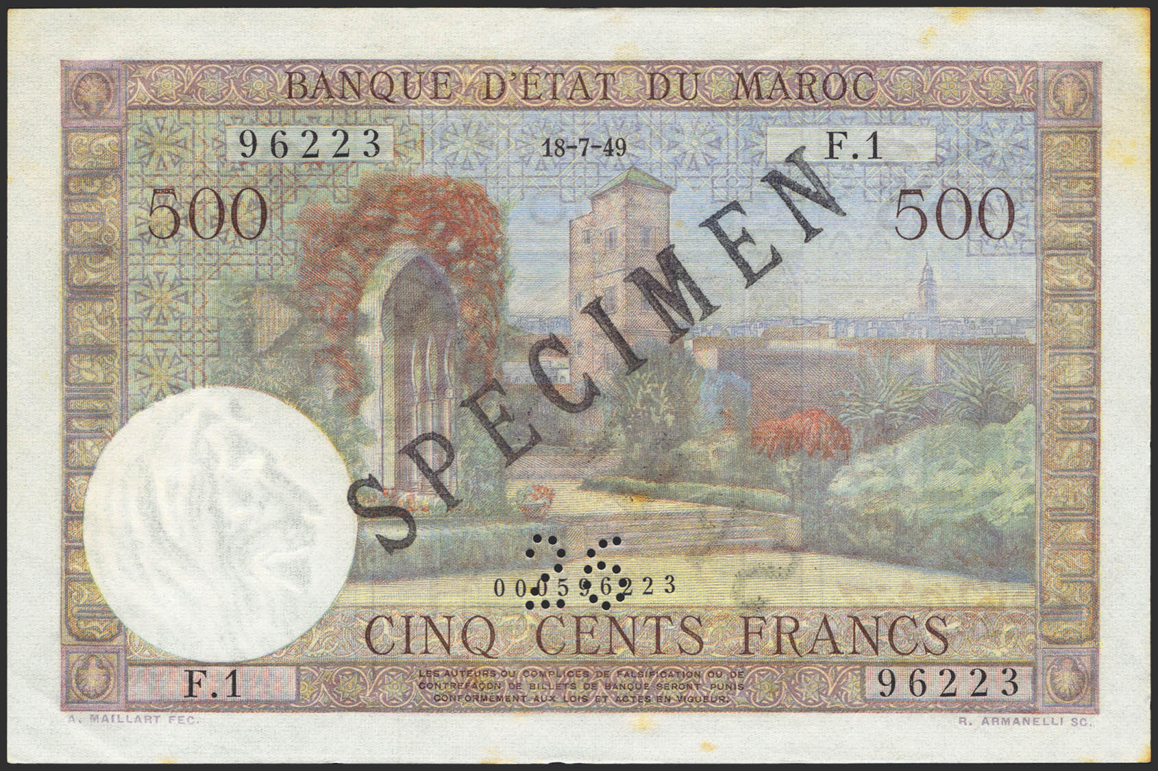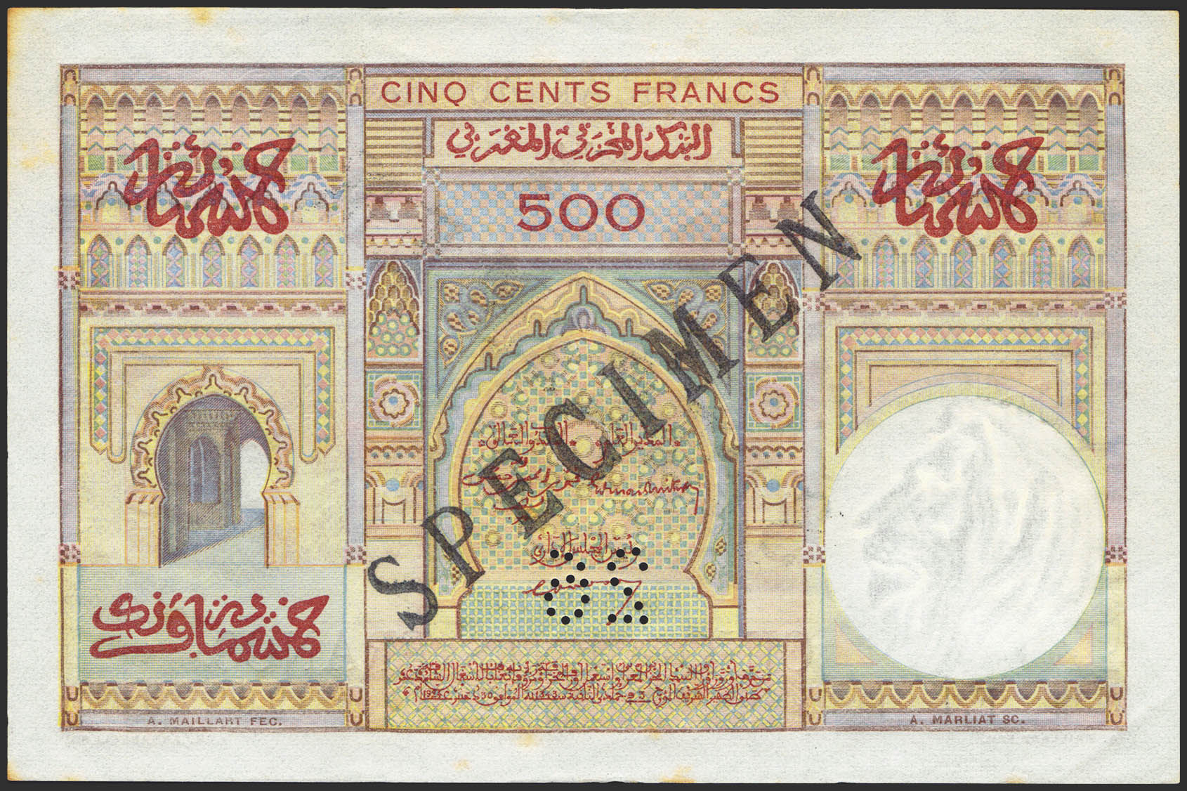 MOROCCO. 500 Francs. 18 July 1949. SPECIMEN and perforated 26. (Pick: 46s). Spots rust. Uncirculated-.