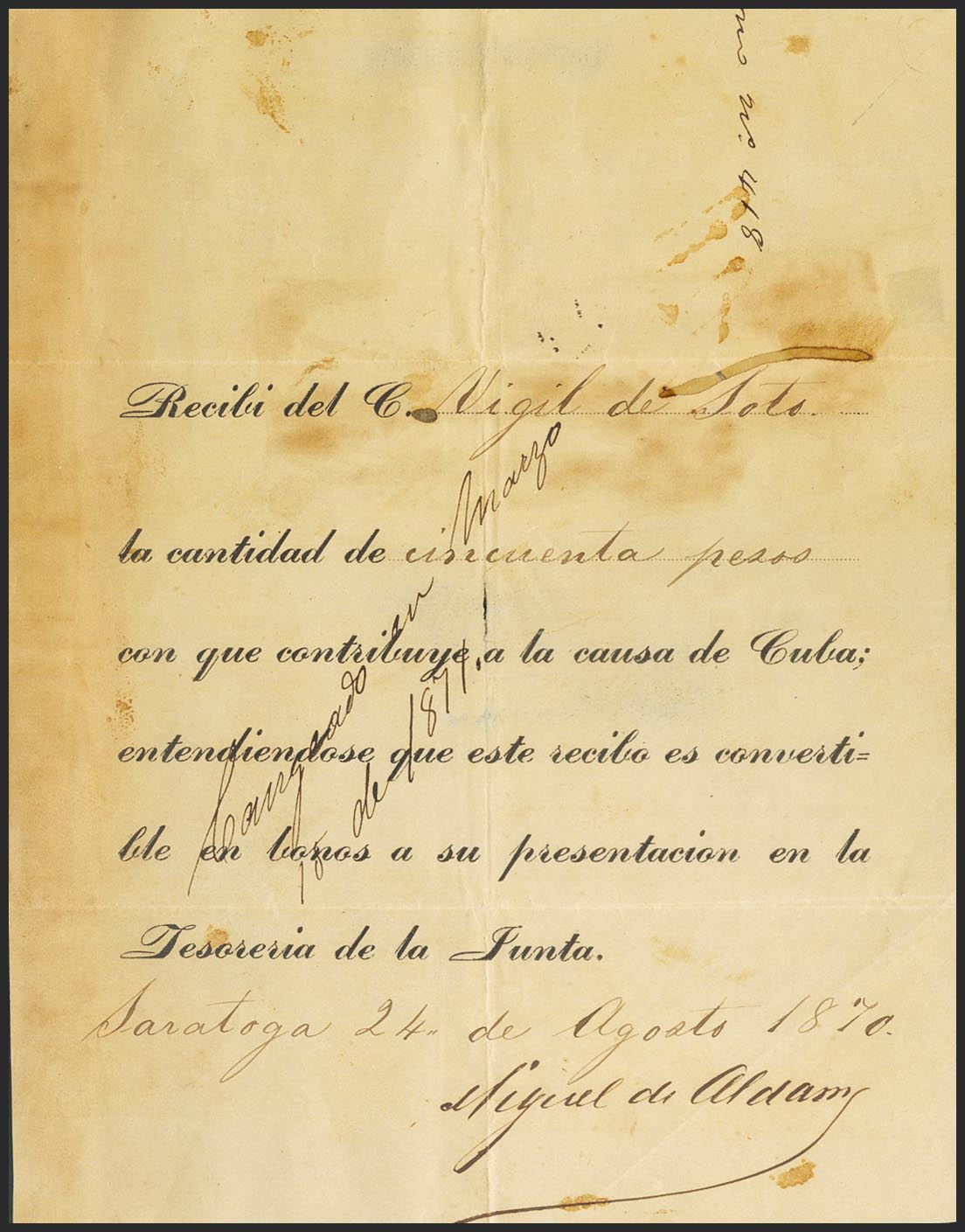 CUBA. Receipt for 50 pesos, convertible into bonds, issued on August 24, 1870 in Saratoga and signed by Miguel de Aldama, inscription "Exchanged on March 15, 1879". Very rare, piece of enormous historical load. Former José Martà Collection, auctioned at Aureo on November 17, 2004, lot No. 5919. On October 10, 1868, the Ten Years War (1868-1878) broke out, the first war for the Independence of Cuba, Aldama was involved in the conspiracies.