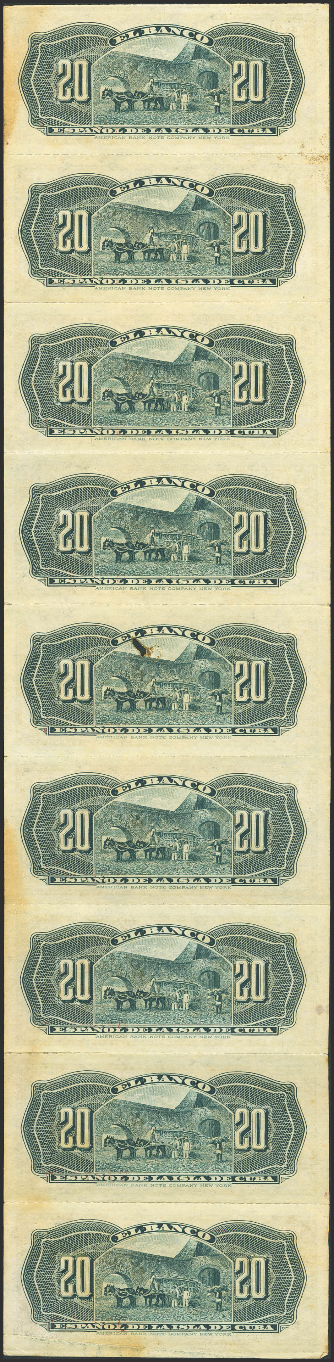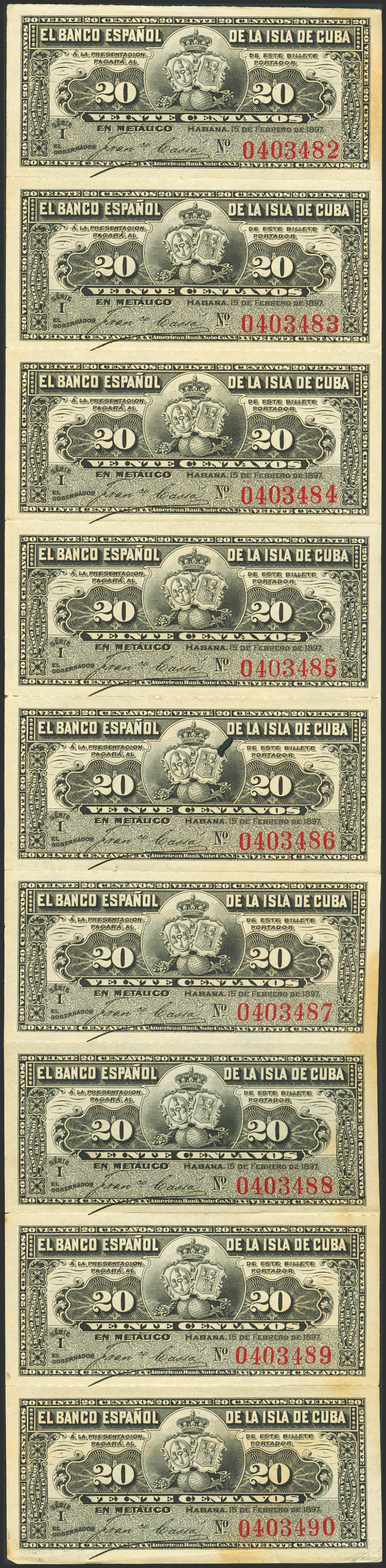 English Spanish Bank of Havana. 20 Centavos. February 15, 1897. 9 banknotes intact. Series I. (Edifil 2023: 85). Unusual, toned, and one of them has a moth spot. Uncirculated-/Uncirculated--.