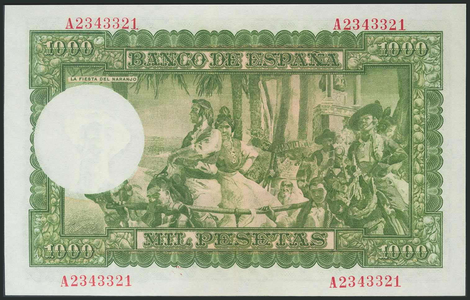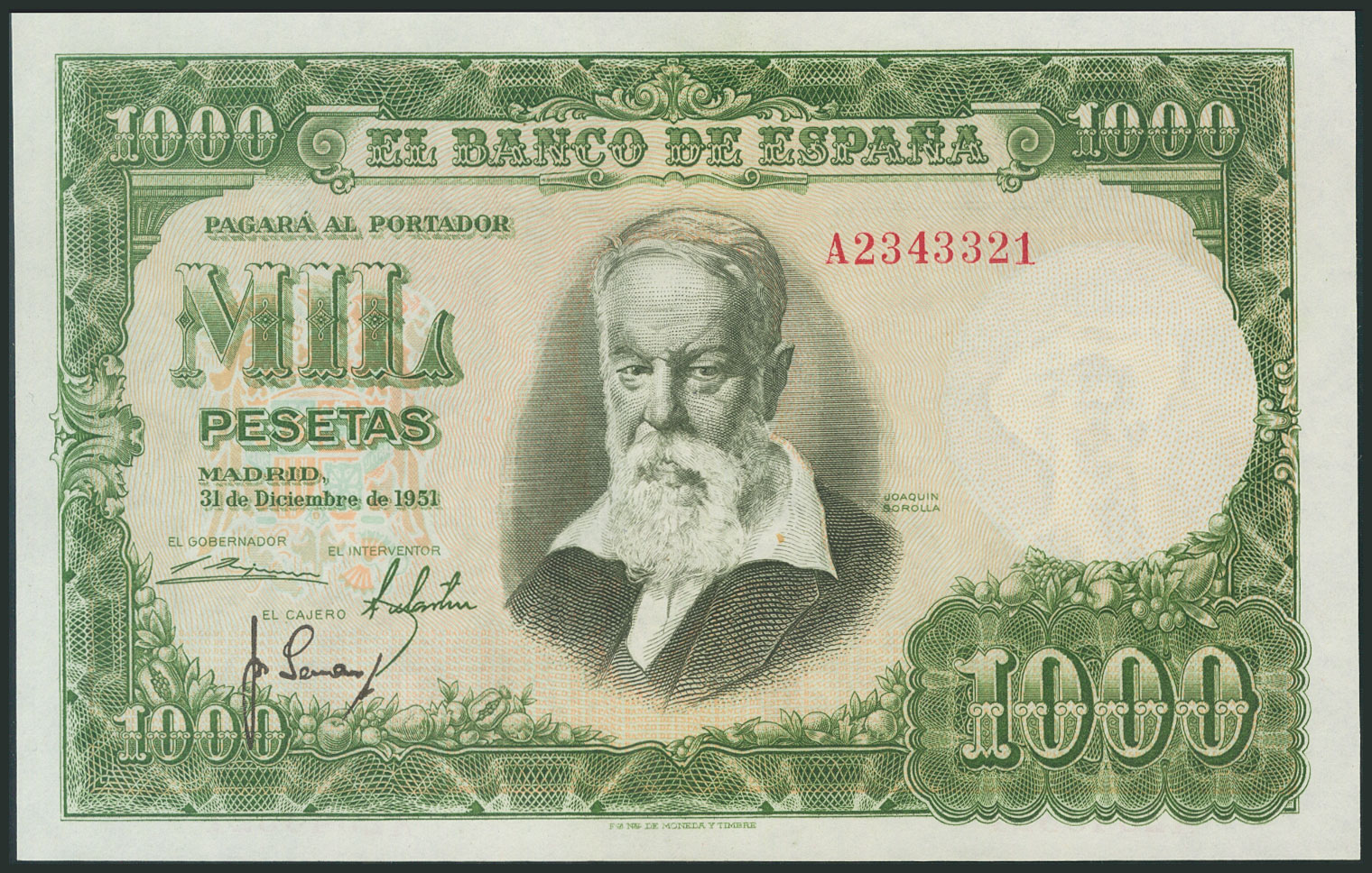 1000 Pesetas. December 31, 1951. Series A. (Edifil 2017: 463a). Invisible vertical fold, original sizing. Good Extremely Fine.