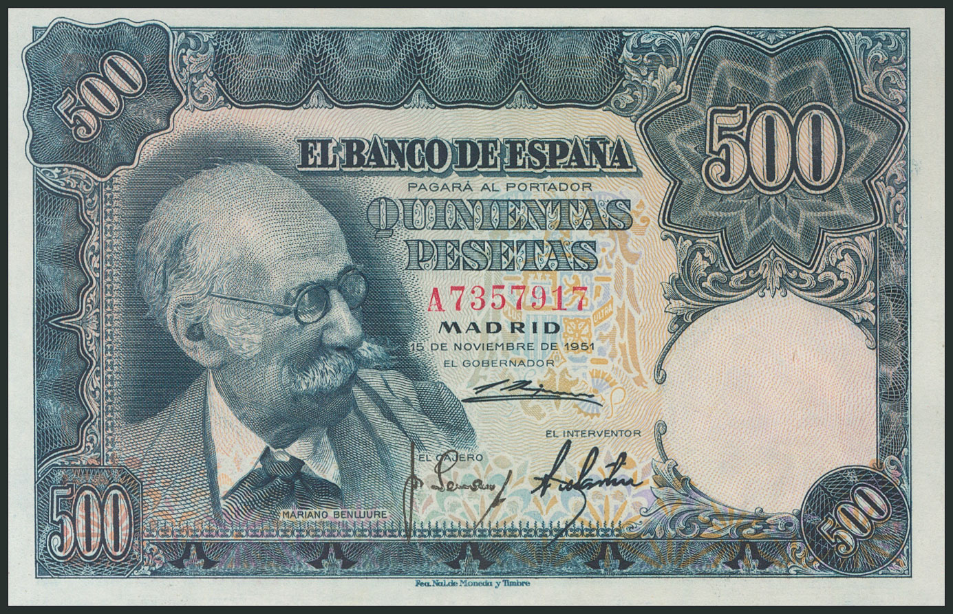 500 pesetas. November 15, 1951. Series A. (Edifil 2017: 460a). Retains much of the original sizing. Good Extremely Fine.