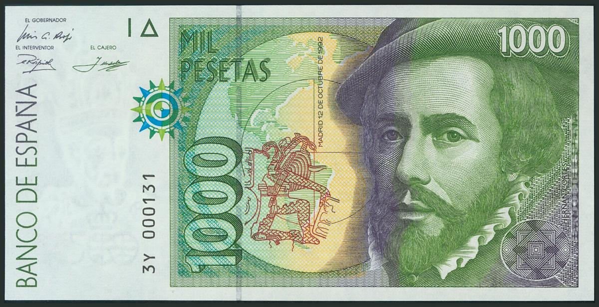 1000 Pesetas. October 12, 1992. Type II. Series 3Y and low numbering and imperfect capicúa. (Edifil 2017: 483b). Uncirculated.