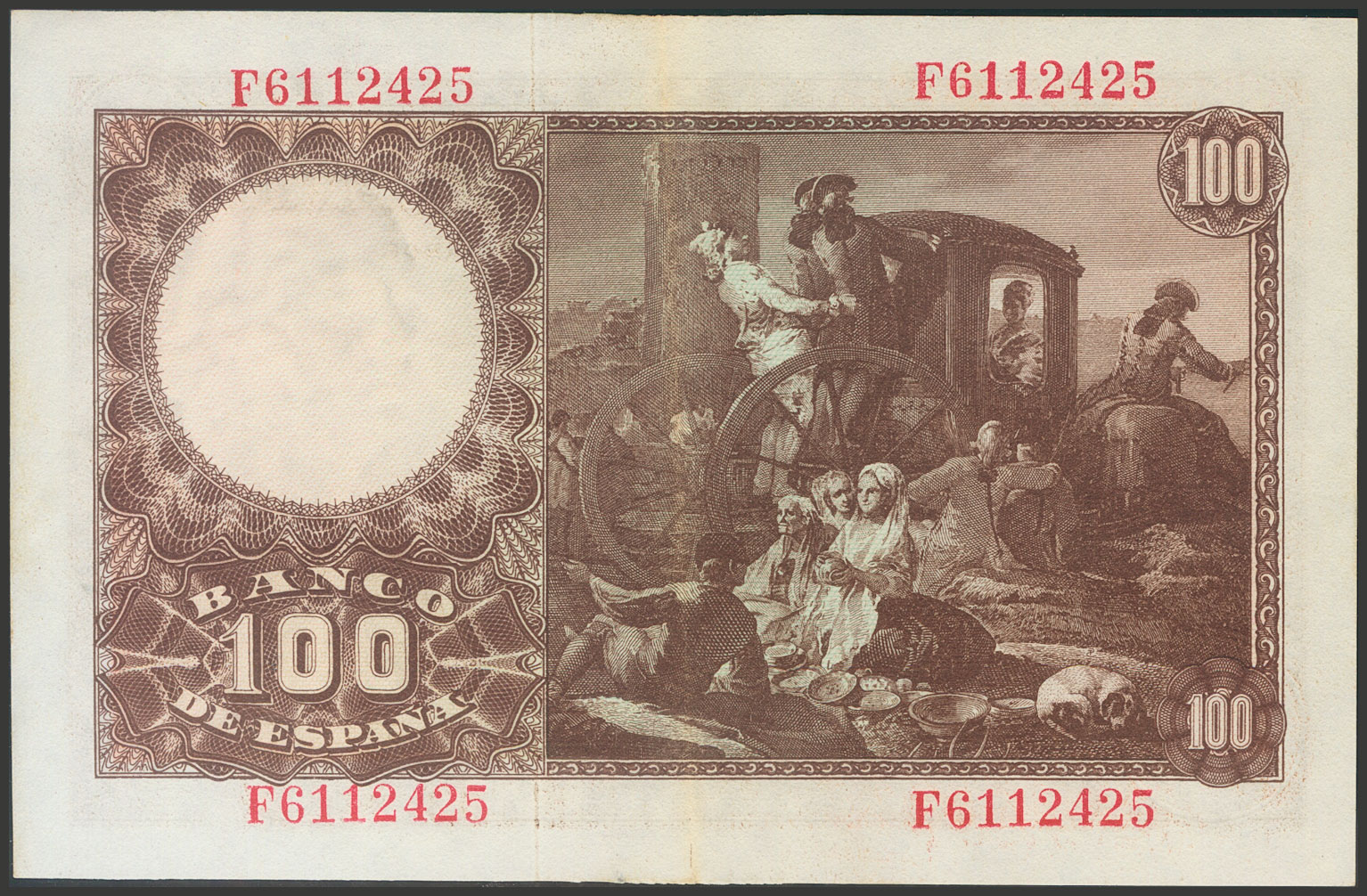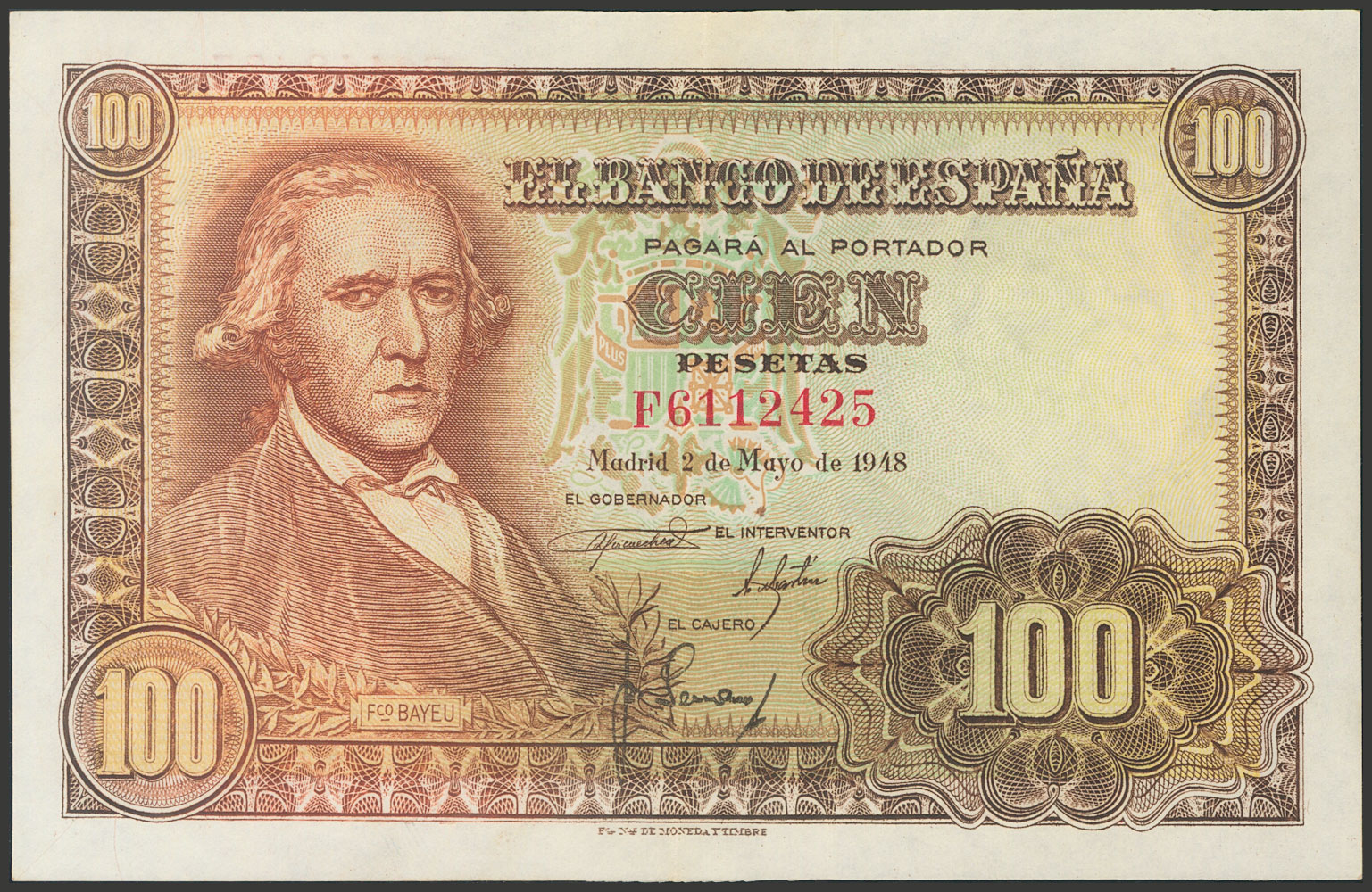 100 pesetas. May 2, 1948. Series F. (Edifil 2017: 456a). Retains part of the original sizing. Good Extremely Fine.