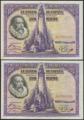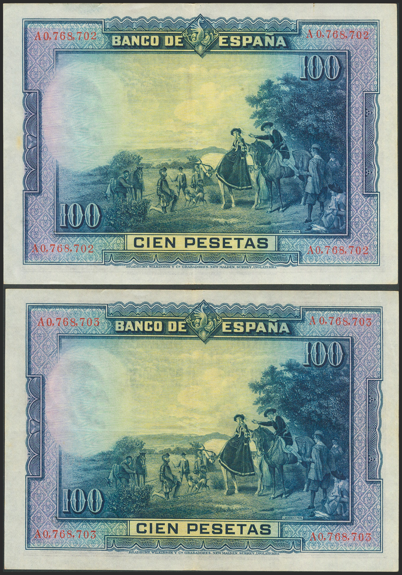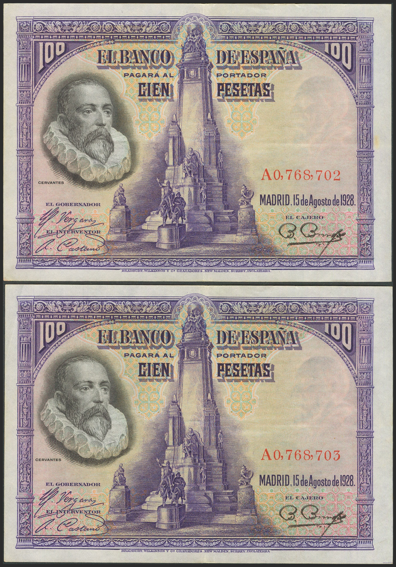 100 pesetas. August 15, 1928. Correlative couple. Series A. (Edifil 2017: 355a). Retains most of the original sizing. Extremely Fine.