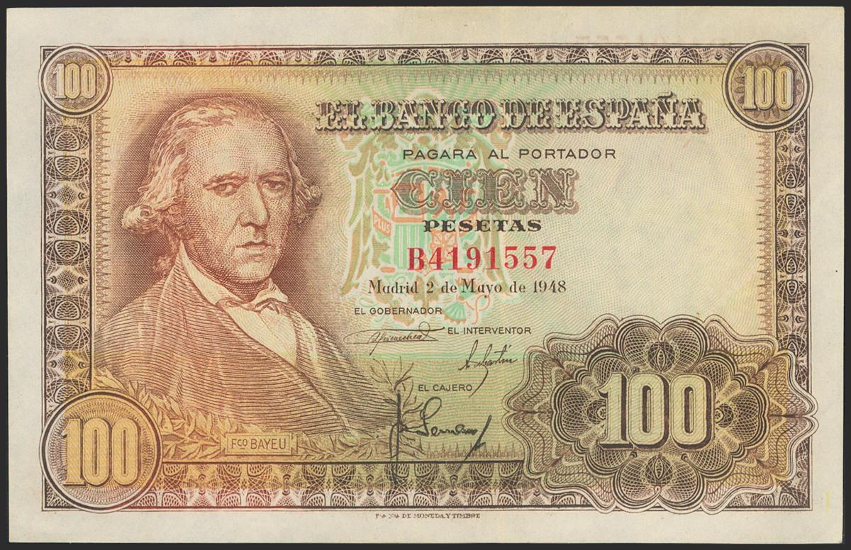 100 pesetas. May 2, 1948. Series B. (Edifil 2021: 456a). Original sizing. Almost Uncirculated-.