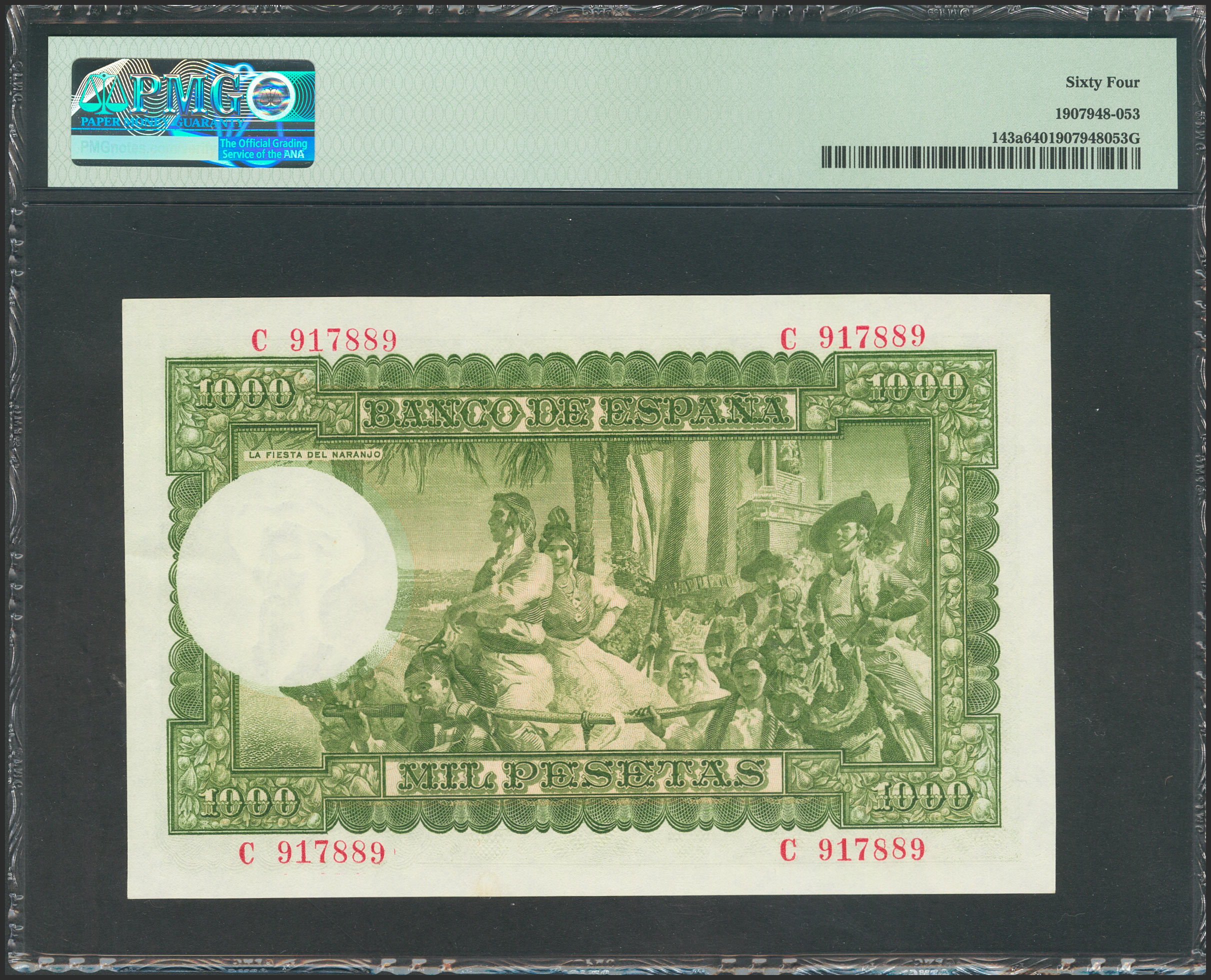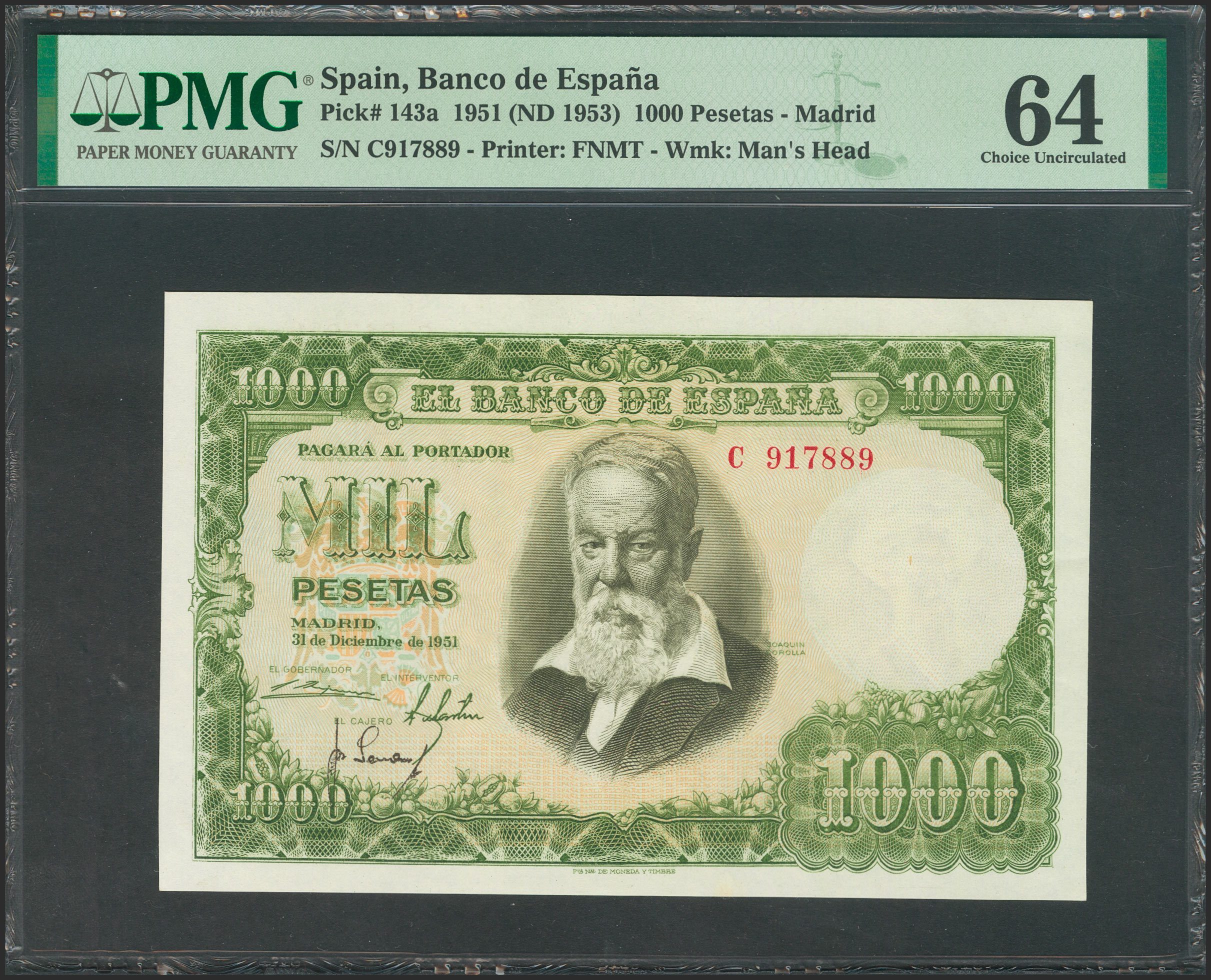 1000 Pesetas. December 31, 1951. Series C. (Edifil 2017: 463a). Rare in this exceptional quality. Uncirculated. PMG64 package.