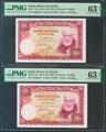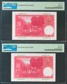English 50 pesetas. December 31, 1951. Correlative couple. Series A. (Edifil 2021: 462a, Pick: 141a). Unusual in this quality, original sizing. Uncirculated. PMG63EPQ package, both.