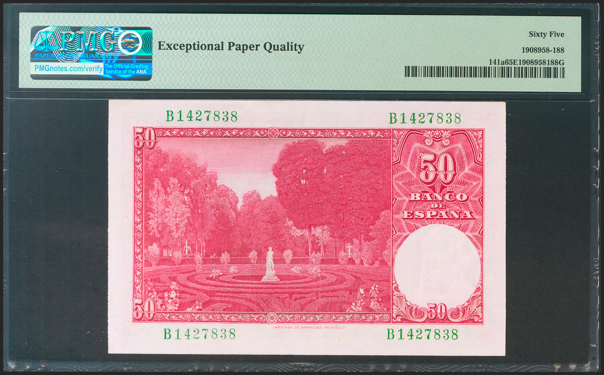 50 pesetas. December 31, 1951. Series B. (Edifil 2021: 462a, Pick: 141a). Rare in this quality, original sizing. Uncirculated. PMG65EPQ package.