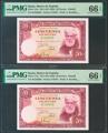 50 pesetas. December 31, 1951. Correlative couple. Series B. (Edifil 2021: 462a, Pick: 141a). Very rare in this quality, original sizing. Uncirculated. PMG66EPQ package, both.