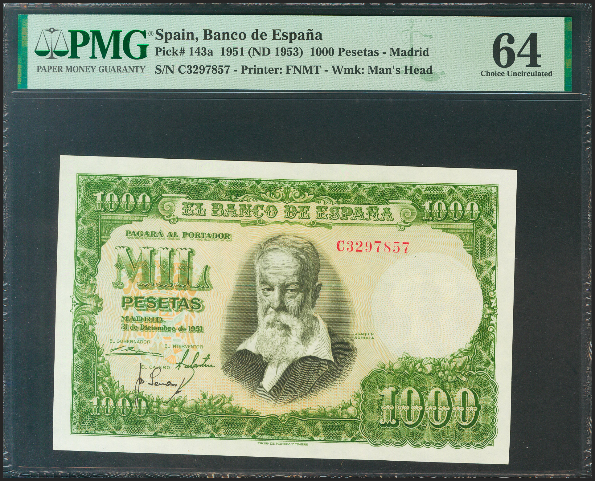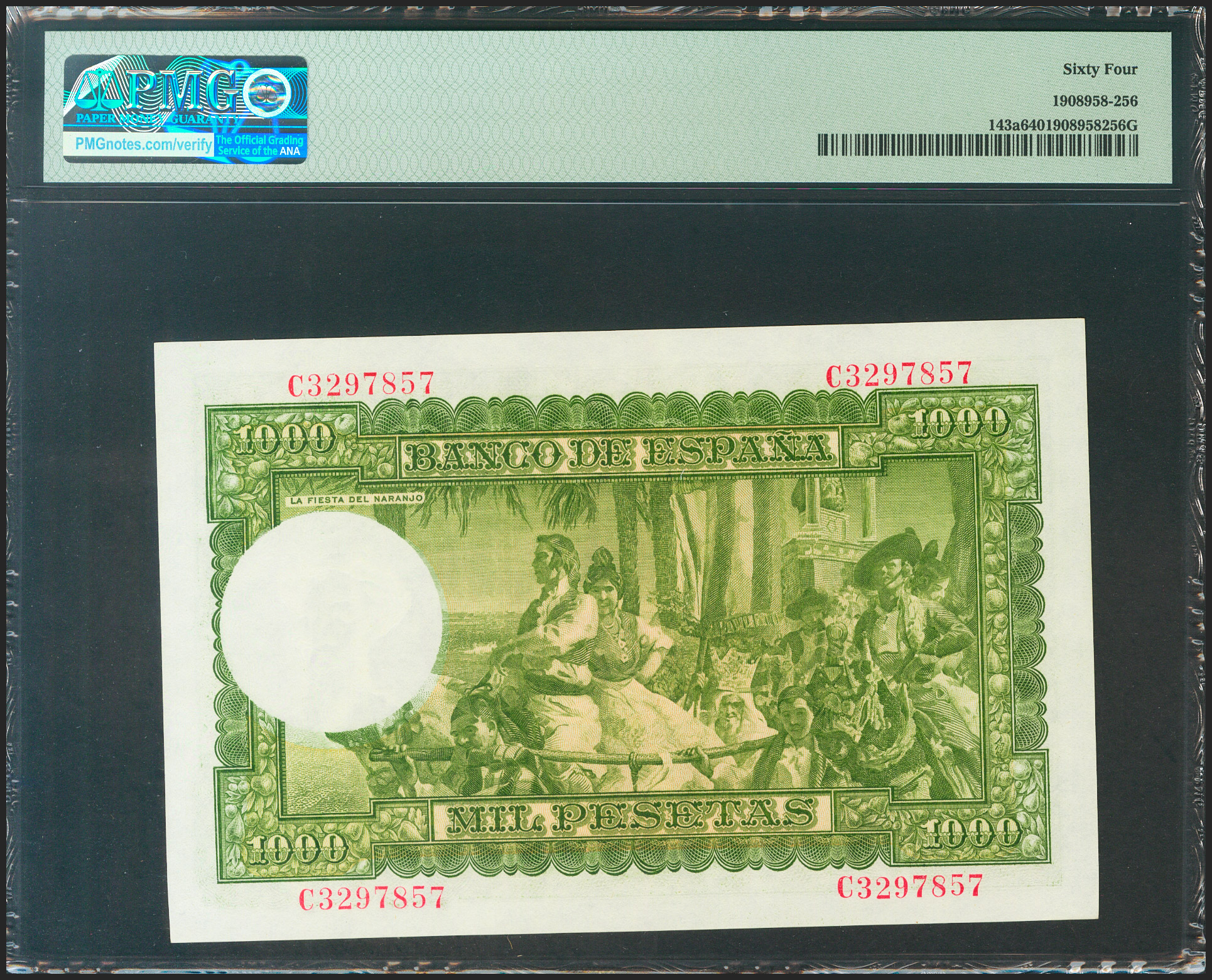 1000 Pesetas. December 31, 1951. Series C, last series issued. (Edifil 2021: 463a, Pick: 143a). Unusual in this quality. Uncirculated. PMG64 package.