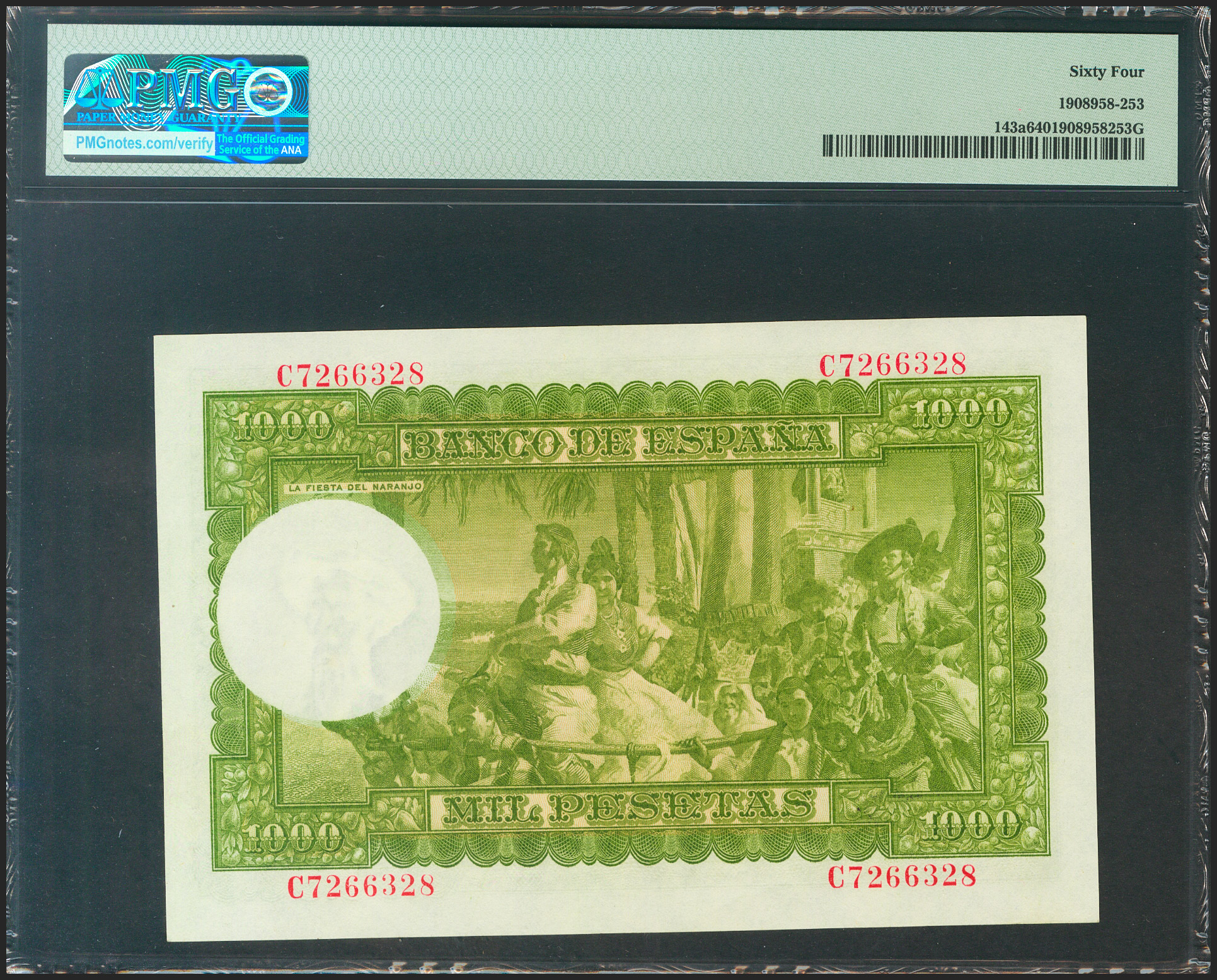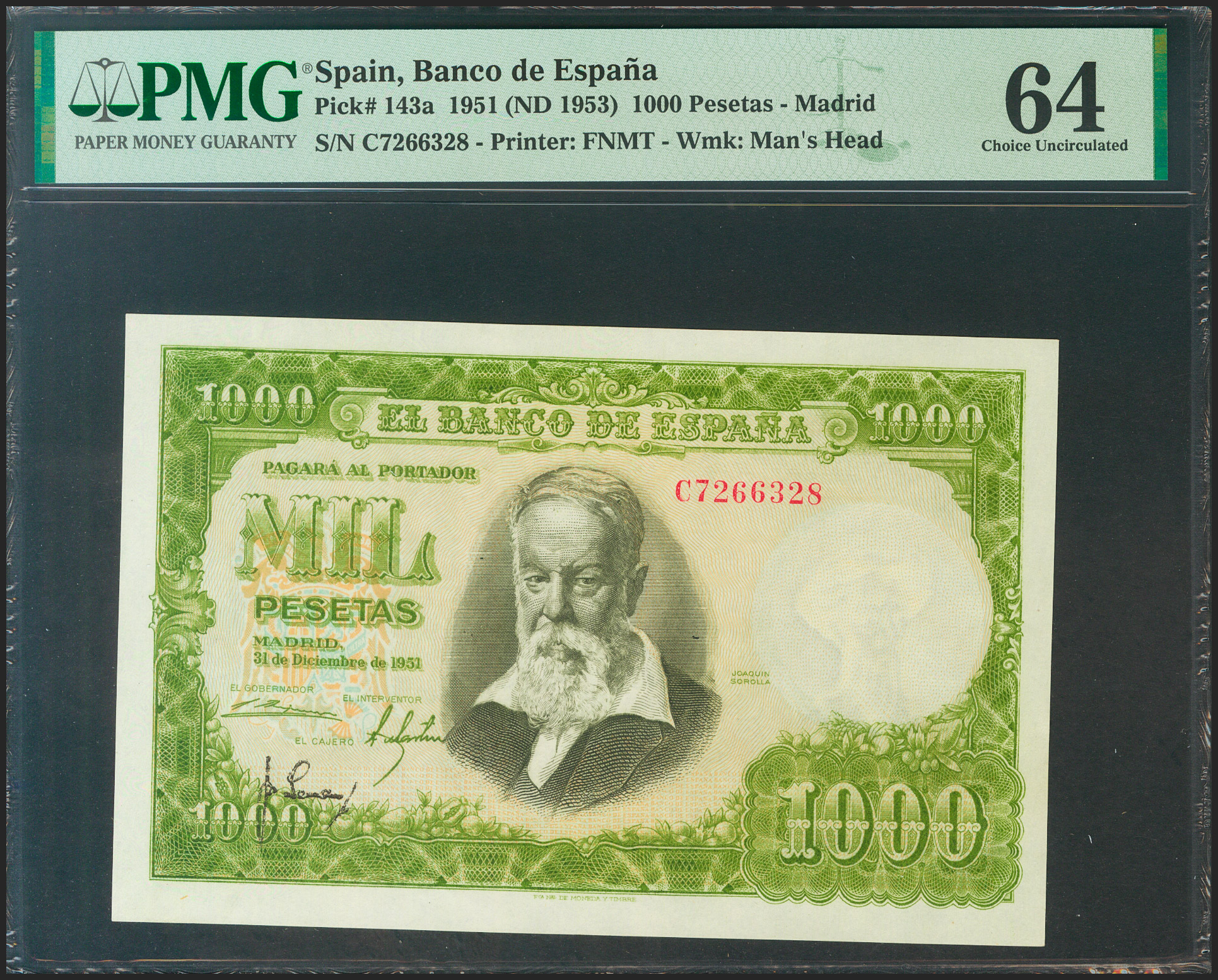 English 1000 Pesetas. December 31, 1951. Series C, last series issued. (Edifil 2021: 463a, Pick: 143a). Unusual in this quality. Uncirculated. PMG64 package.