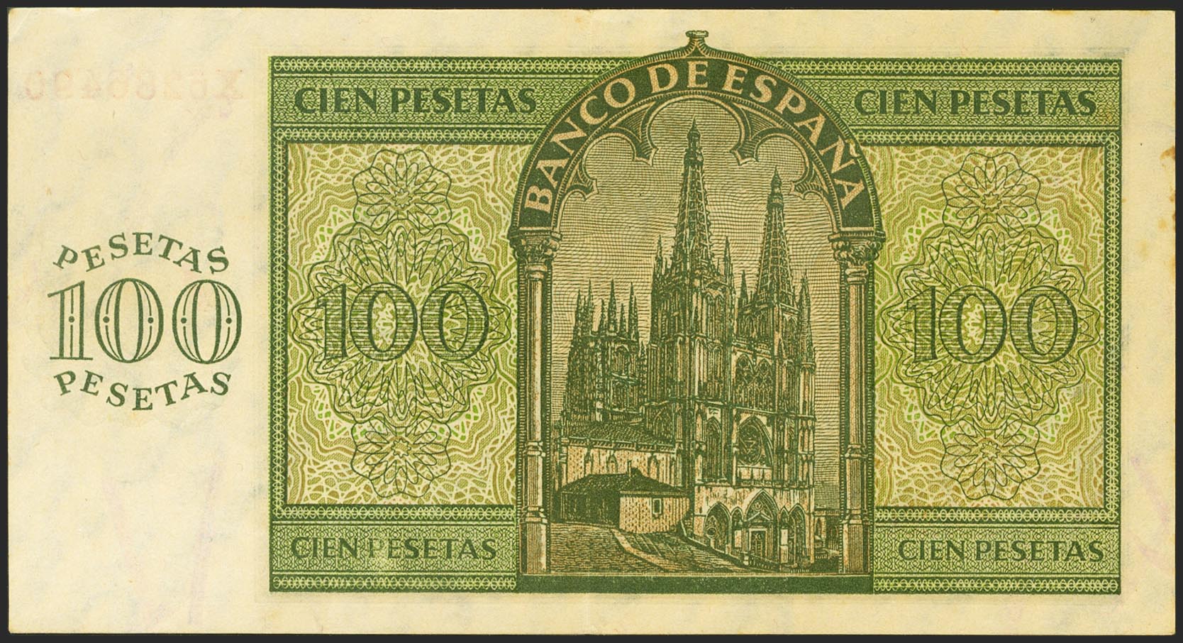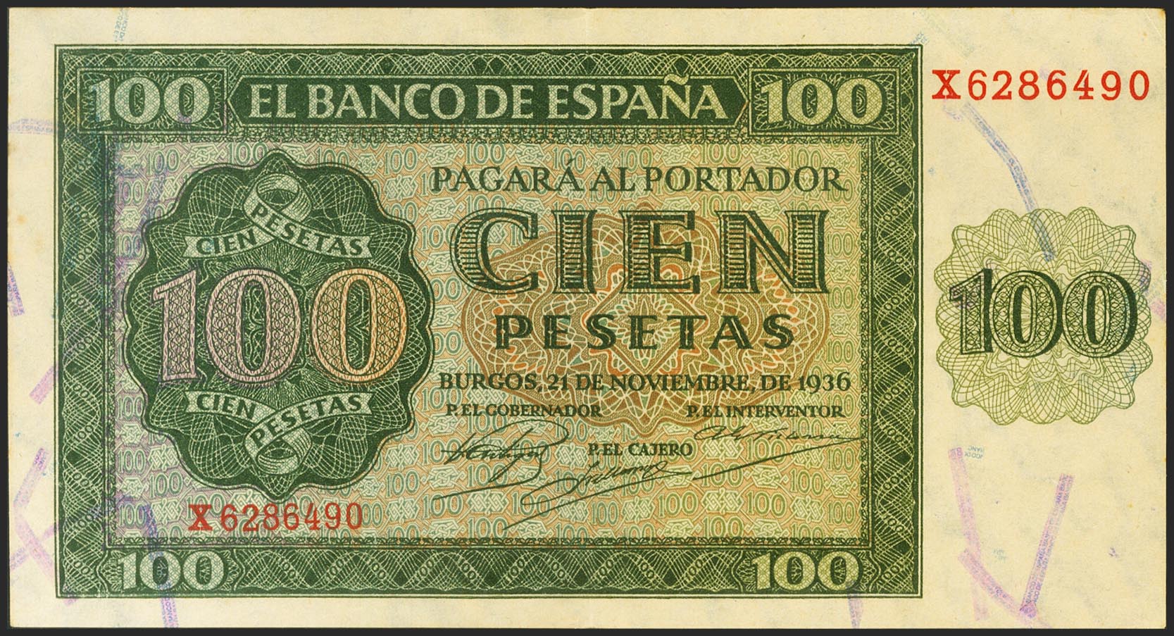 English 100 pesetas. November 21, 1936. Series X, last series issued. (Edifil 2021: 421a). Retains part of the original sizing. Good Extremely Fine.