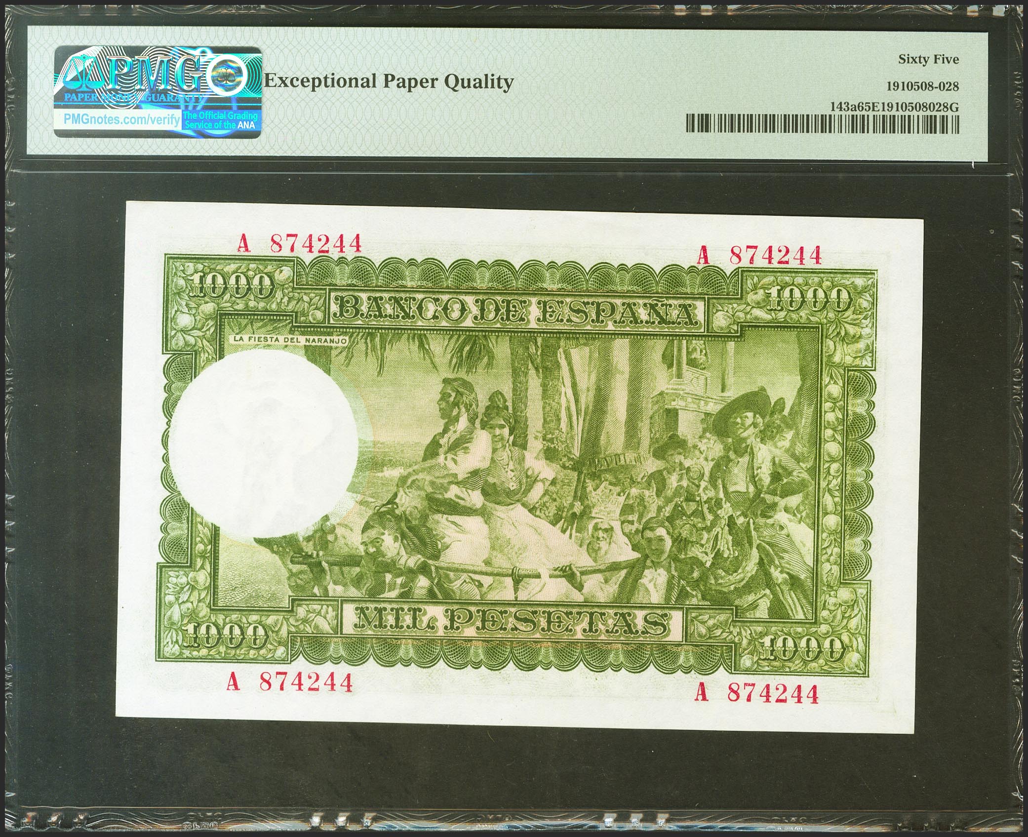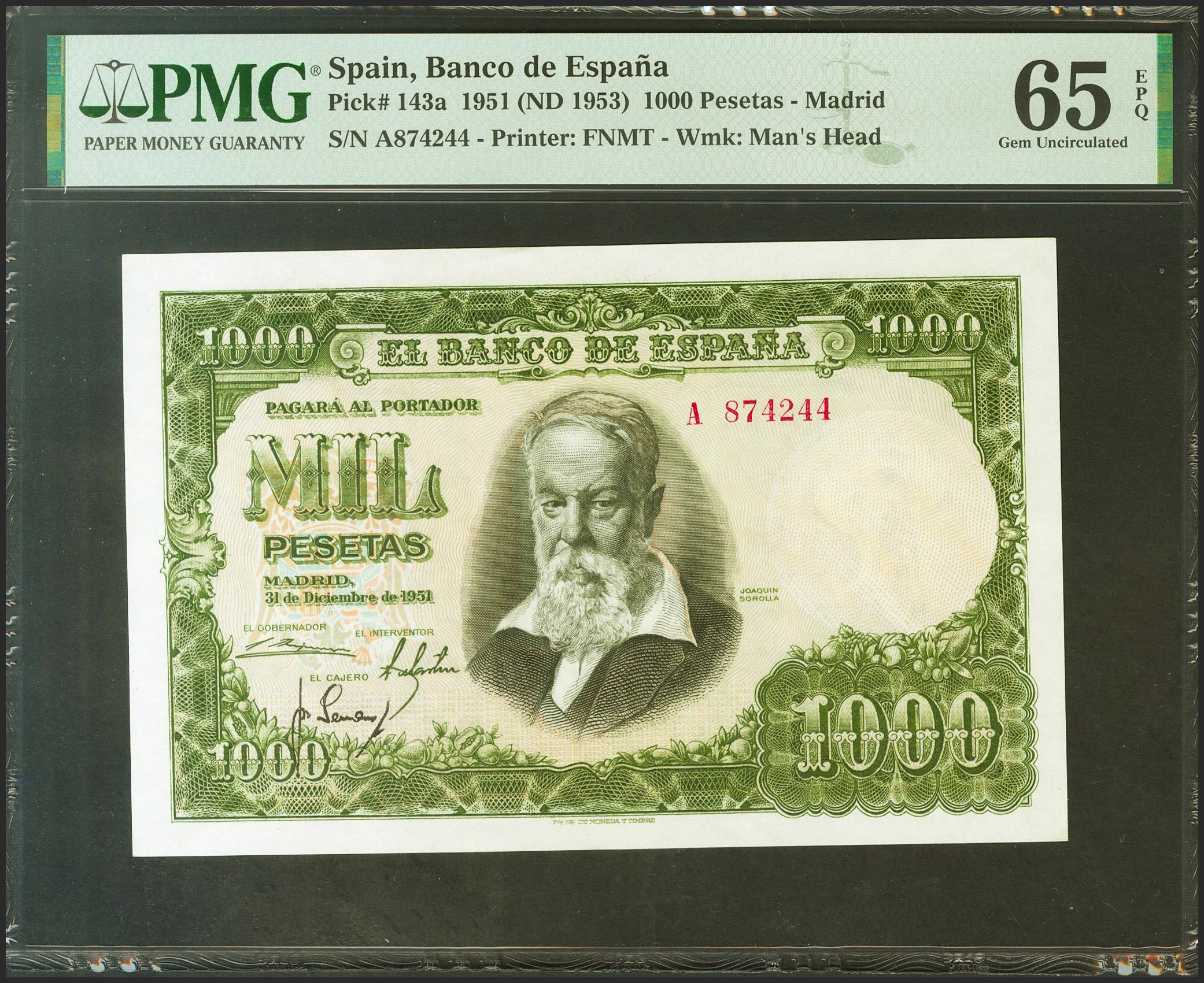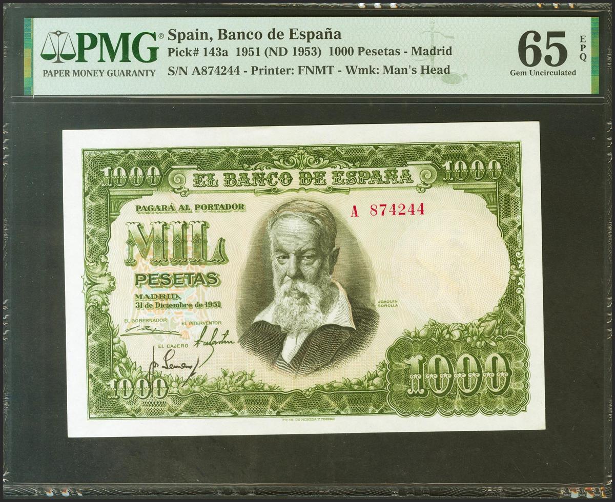 1000 Pesetas. December 31, 1951. Series A. (Edifil 2021: 463a). Unusual in this quality, retaining all its original sizing. Uncirculated. PMG65EPQ package.